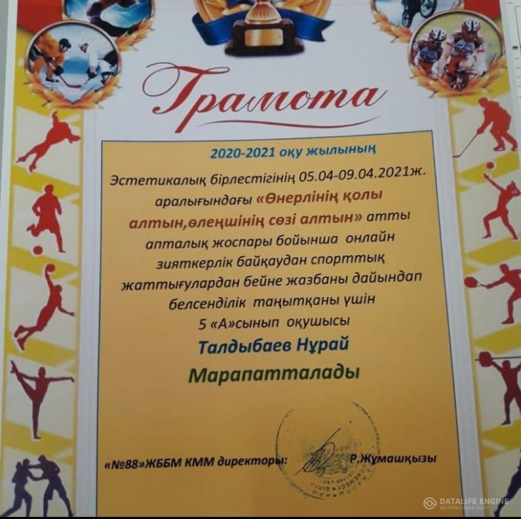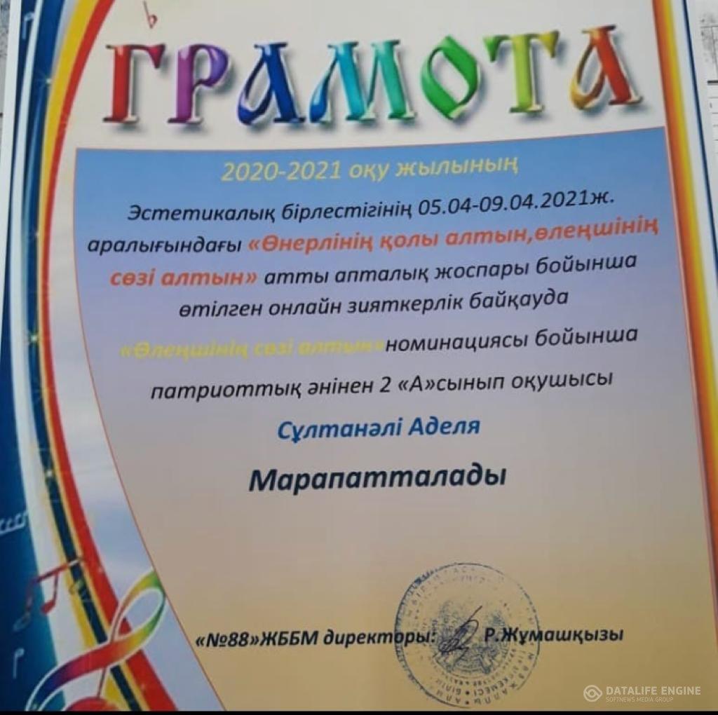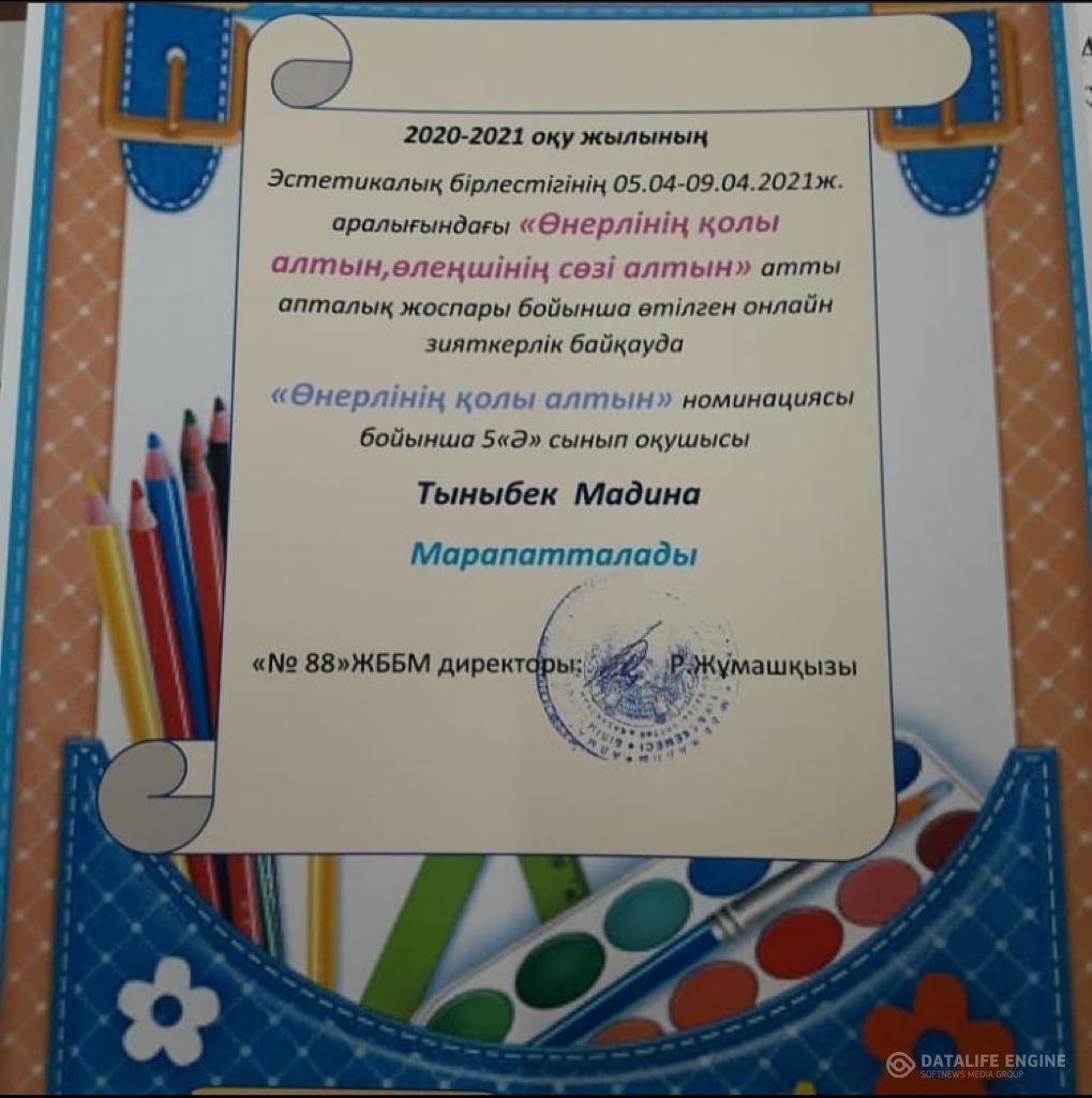 22 апрель 2021 0 1 2 3 4 5 Құттықтаймыз!!! "Өнерлінің қолы алтын, өлеңшінің сөзі алтын" атты эстетикалық әдіс бірлестігінің атпалығының қорытындысы. Зияткерлік онлайн сайысына аса белсенді қатысқан оқушыларға алғыс білдіреміз. Талаптарыңа нұр жаусын