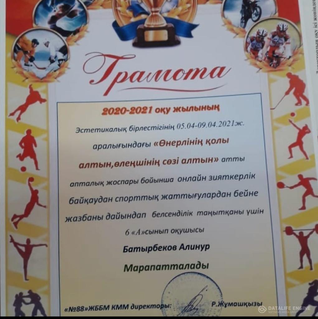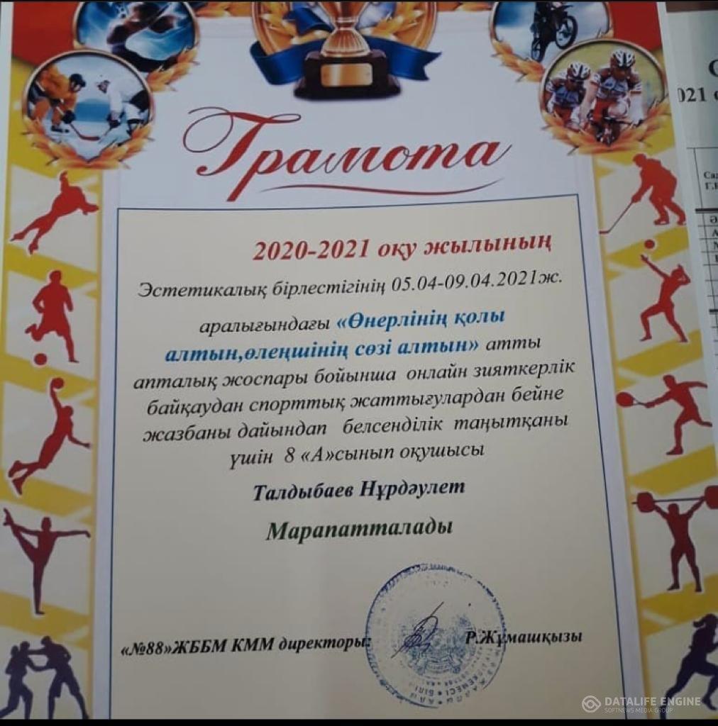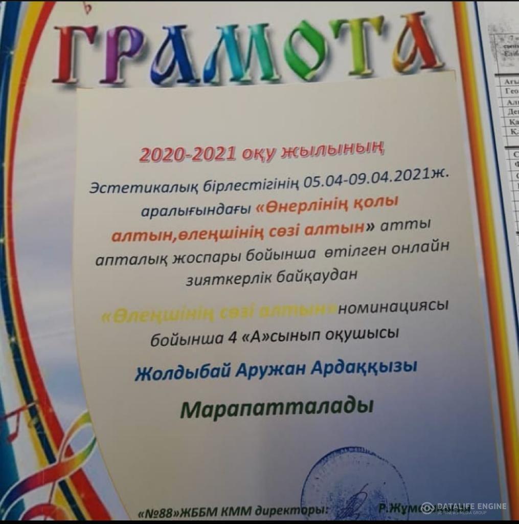 22 апрель 2021 0 1 2 3 4 5 Құттықтаймыз!!! "Өнерлінің қолы алтын, өлеңшінің сөзі алтын" атты эстетикалық әдіс бірлестігінің атпалығының қорытындысы. Зияткерлік онлайн сайысына аса белсенді қатысқан оқушыларға алғыс білдіреміз. Талаптарыңа нұр жаусын