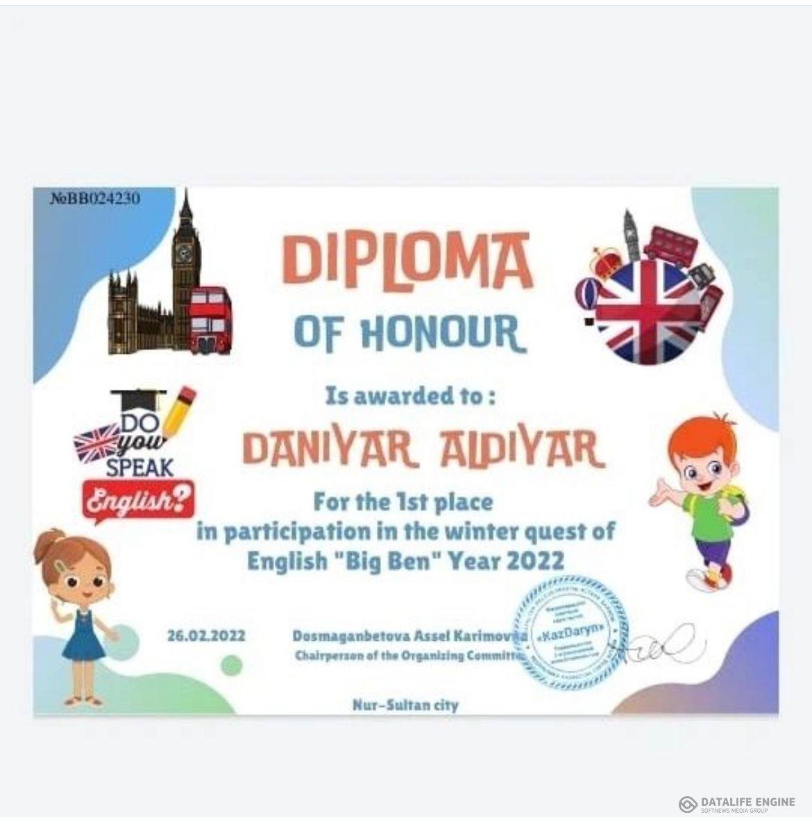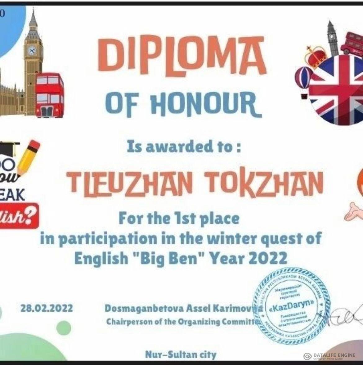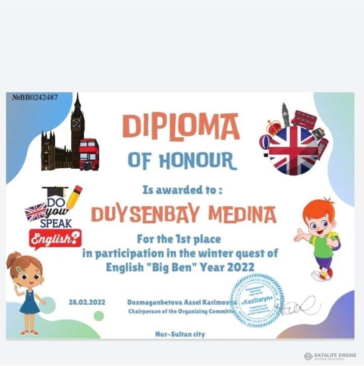 19 май 2022 0 1 2 3 4 5 For the 1st place in participation in the winter quest of English "Big Ben year-2022" Diploma of honor is awarded to: 1. Daniyar Aldiar 5 Ә 2. Samat Elnura 6 А 3. Tleuzhan Togzhan 7 А 4. Duysenbai Medina 7 А