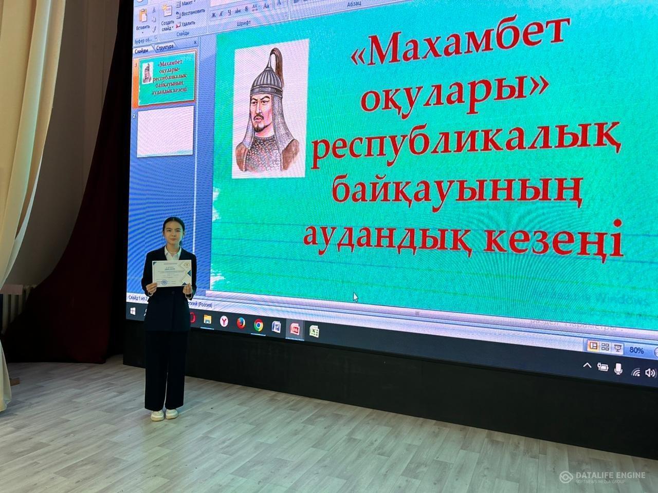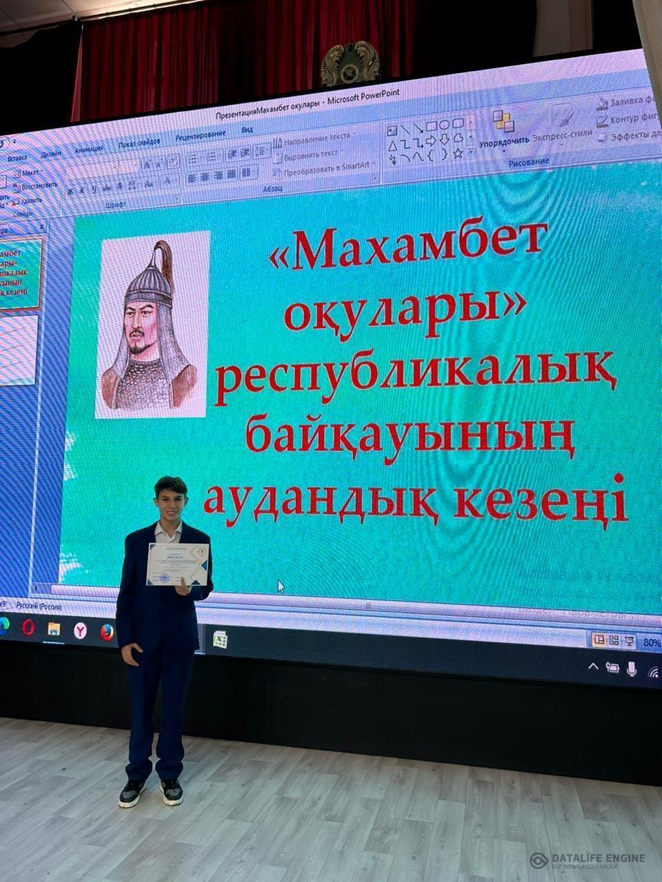 07.11.2023 жылы өткен 8-11 сыныптар арасындағы «Махамбет оқулары» республикалық байқауының аудандық кезеңінде мектебімізден Есенғазиева Ақниет 10 «А» сынып оқушысы «Біз неткен ер, неткен ер?» номинациясы бойынша ІІІ ОРЫН, Хомутцов Василий 11«А» сынып оқушысы «Ел құтқарар ер едім...»номинациясы бойынша ІІІ ОРЫН алды. Жетекшісі:Н.М. Бағыбаева, Ш.К.Темирбекова.