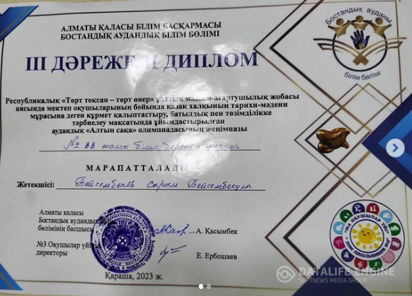 Математика пәнінен 3-4 сынып арасында өткізілген "Алтын сақа" олимпиадасының аудандық кезеңінде көрсеткен жетістігі үшін 4 "Ә" сынып оқушысы Жақып Санжар грамотамен марапатталды.жетекшісі Намазбаева Айгуль Султангожаевна