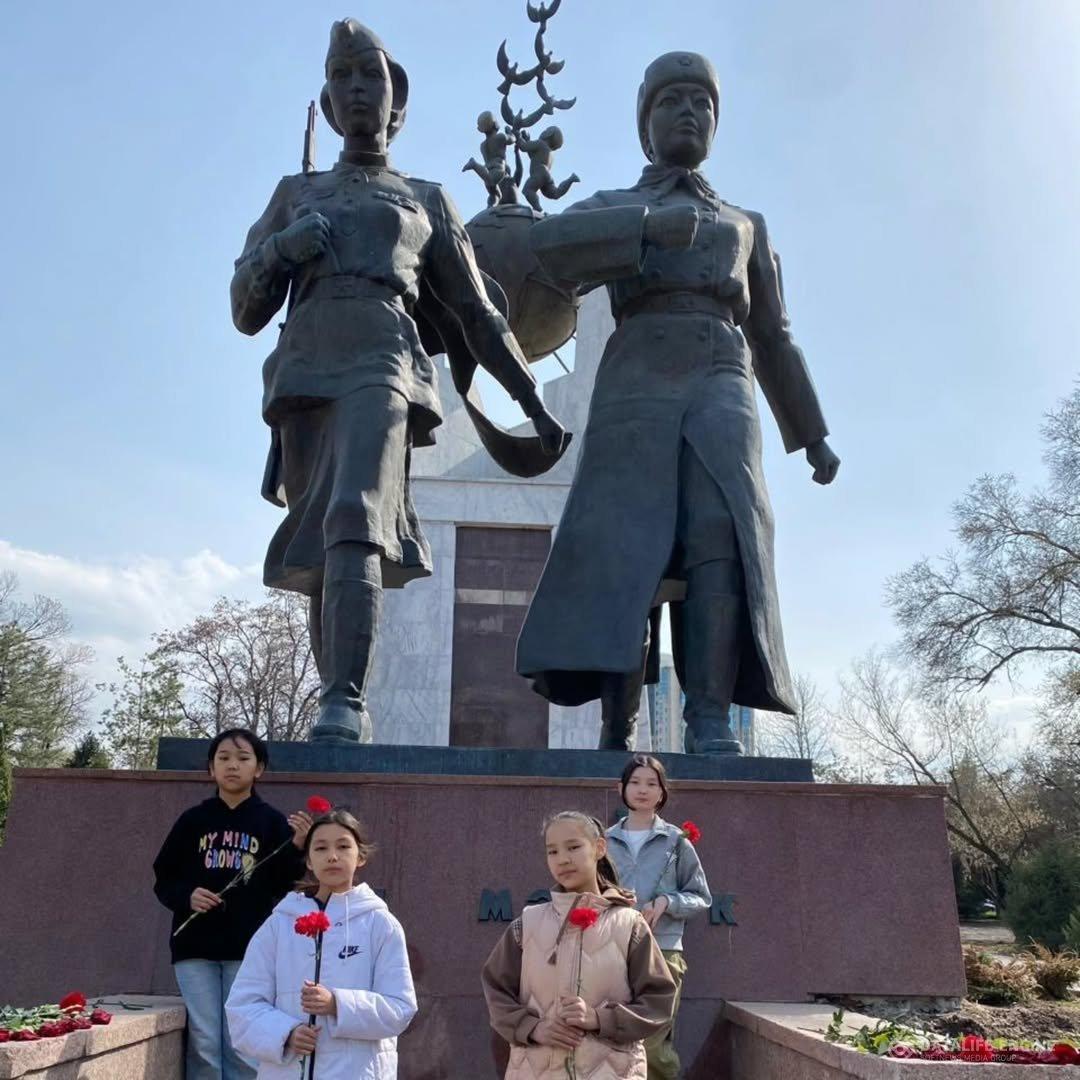 6 "ә"сынып оқушыларының "Ұлы Жеңіс мұрагерлері" жобасы аясында Әлия мен Мәншүк мемориалды скверінде тапсырманы орындауы.