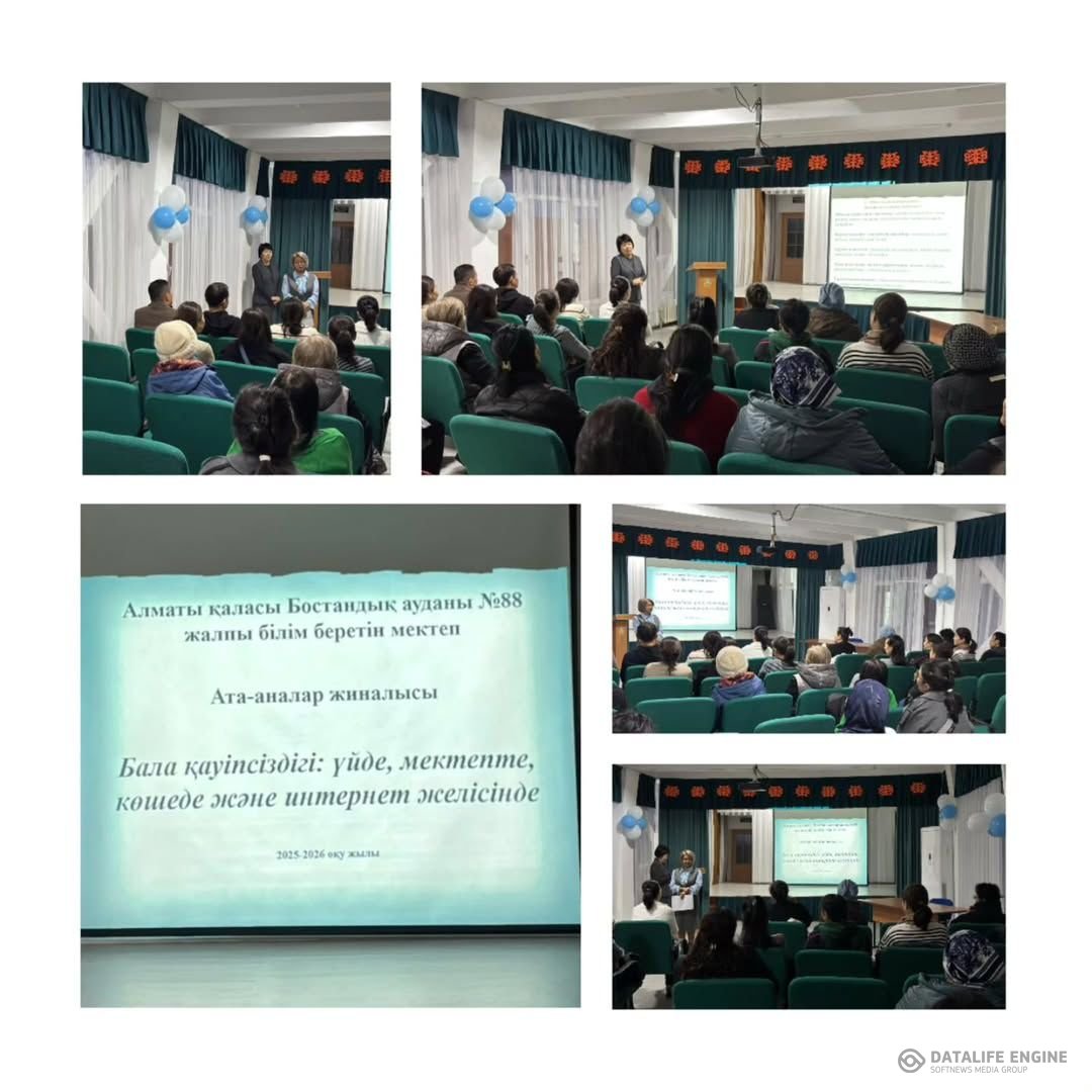 Алматы қаласы Білім басқармасының Қалалық білім берудегі жаңа технологиялардың ғылыми-әдістемелік орталығының 11.11.2025ж. №01.1-22/971 хаты негізінде мектепішілік ата-аналар жиналысы 1-4,5-9, 10-11сыныптармен өтті. Бастауыш сынып ата-аналарына "Бала қауіпсіздігі: мектепте, үйде, көшеде, интернет желісінде" тақырыбымен жиналыс өткізілді.Бастауыш сынып оқушысының мінез-қүлқы, жауапкершілік нормалары презентация ретінде көрсетілді, қауіпсіздік ережелері таныстырылды. Қауіпсіздікті сақтау жадынамалары ата-аналарға таратылды.