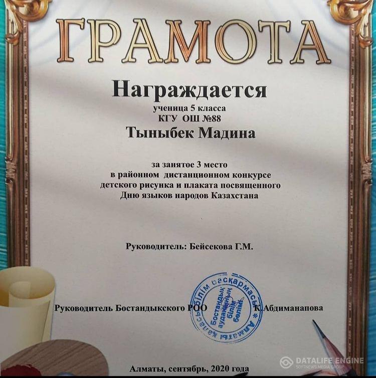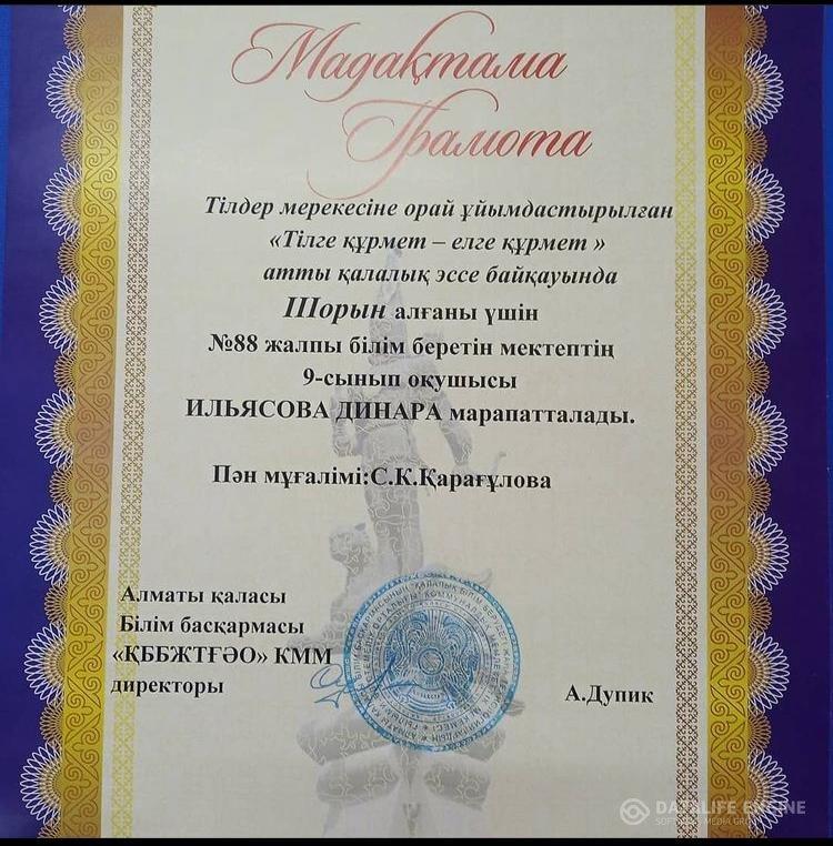 Тіл мерекесіне арналған "Тілге құрмет-елге құрмет" қалалық шығармалар байқауының ІІІ орын жеңімпазы 9 "А" сынып оқушысы Ильясова Динара. Пән мұғалімі Қарағұлова Света