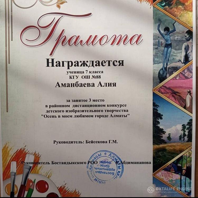 "Менің сүйікті қалам Алматыдағы күз" аудандық суреттер конкурсының 3 орын жүлдегері 7 "А" сынып оқушысы Аманбаева Алия