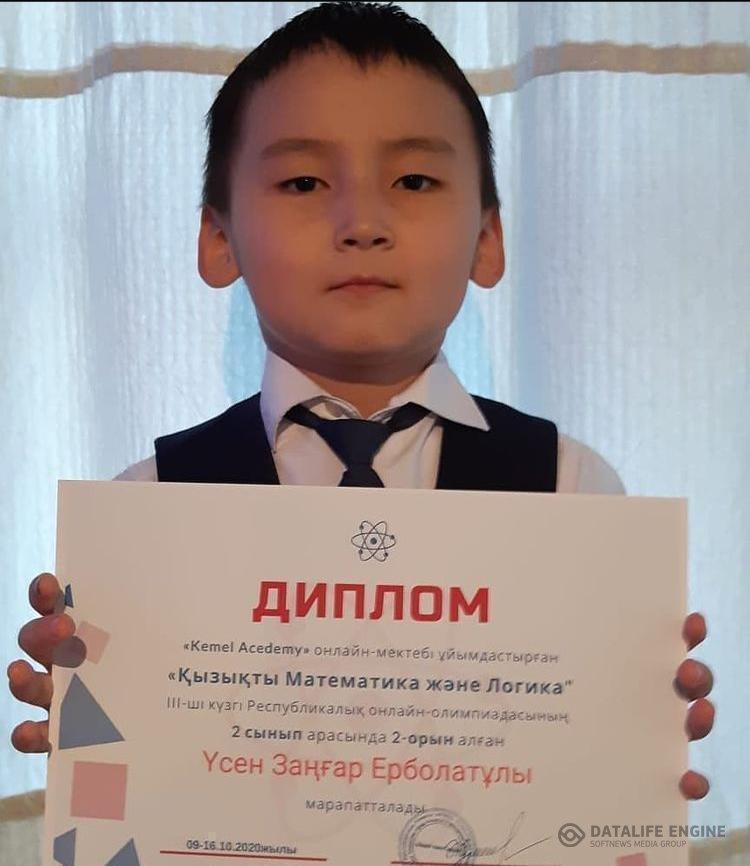 Математика пәнінен "Қызықты математика және логика" ІІІ-ші күзгі Республикалық онлайн олимпиадасының 2 орын жеңімпазы 2 "А" сынып оқушысы Үсен Заңғар. Пән мұғалімі Садирмекова Гүлзира
