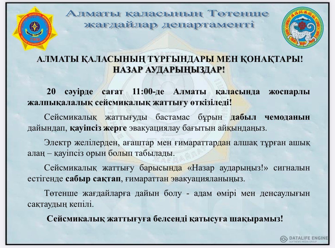 20 апрель 2023 0 1 2 3 4 5 Мектебімізде сейсмикалық жаттығу өткізілді. Жаттығу барысында мектеп қызметкерлері мен оқушылар қауіпсіз орынға шығарылды, жерсілкінісі кезіндегі қауіпсіздік ережелері ,дабыл чемоданы туралы мәліметтер берілді.