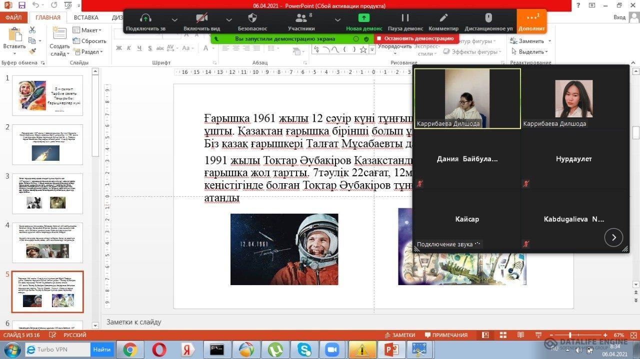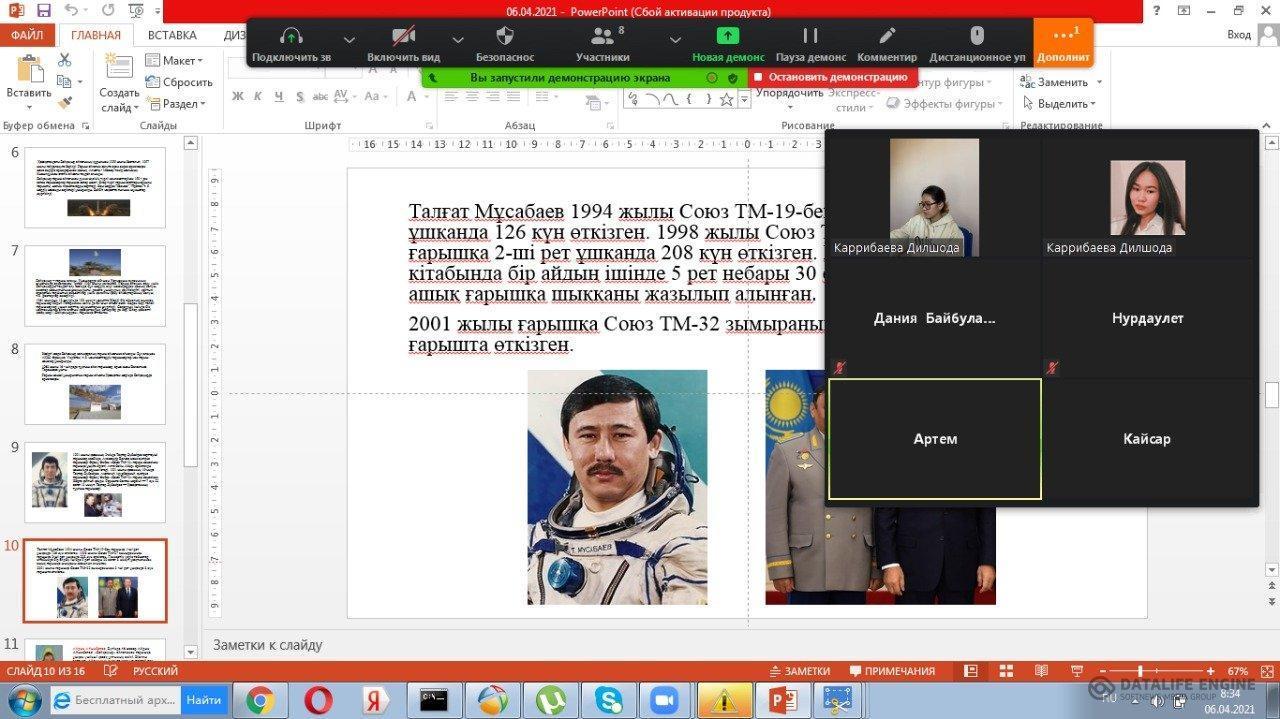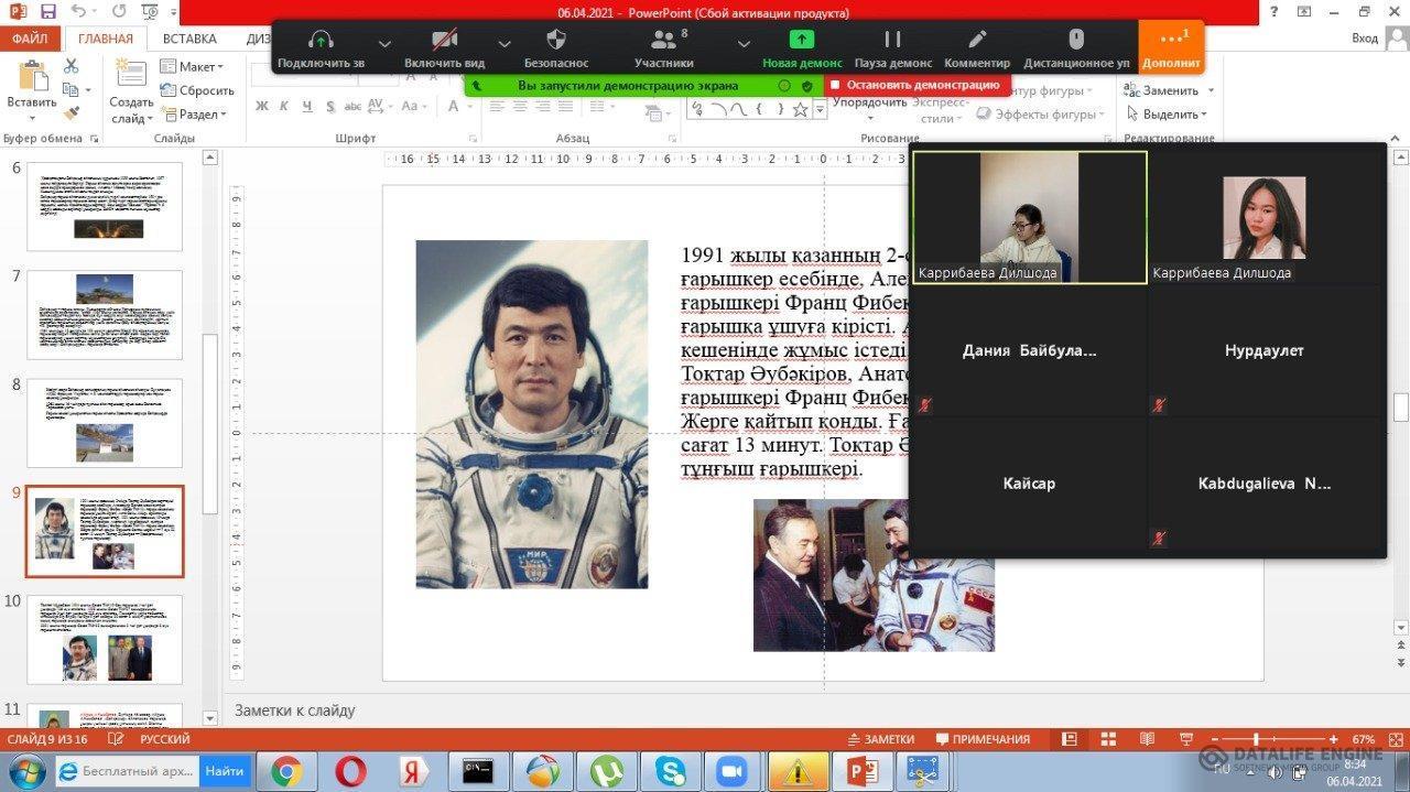 06 апрель 2021 0 1 2 3 4 5 "Қазақстан ғарышкерлері" Қазақстан тұңғыш ғарышкері Т. Әубәкіровтың туғанына 75 жыл "Қазақстан ғарышкерлері" 8 "А" сынып оқушылары Сынып жетекшісі Ахмедова Р.