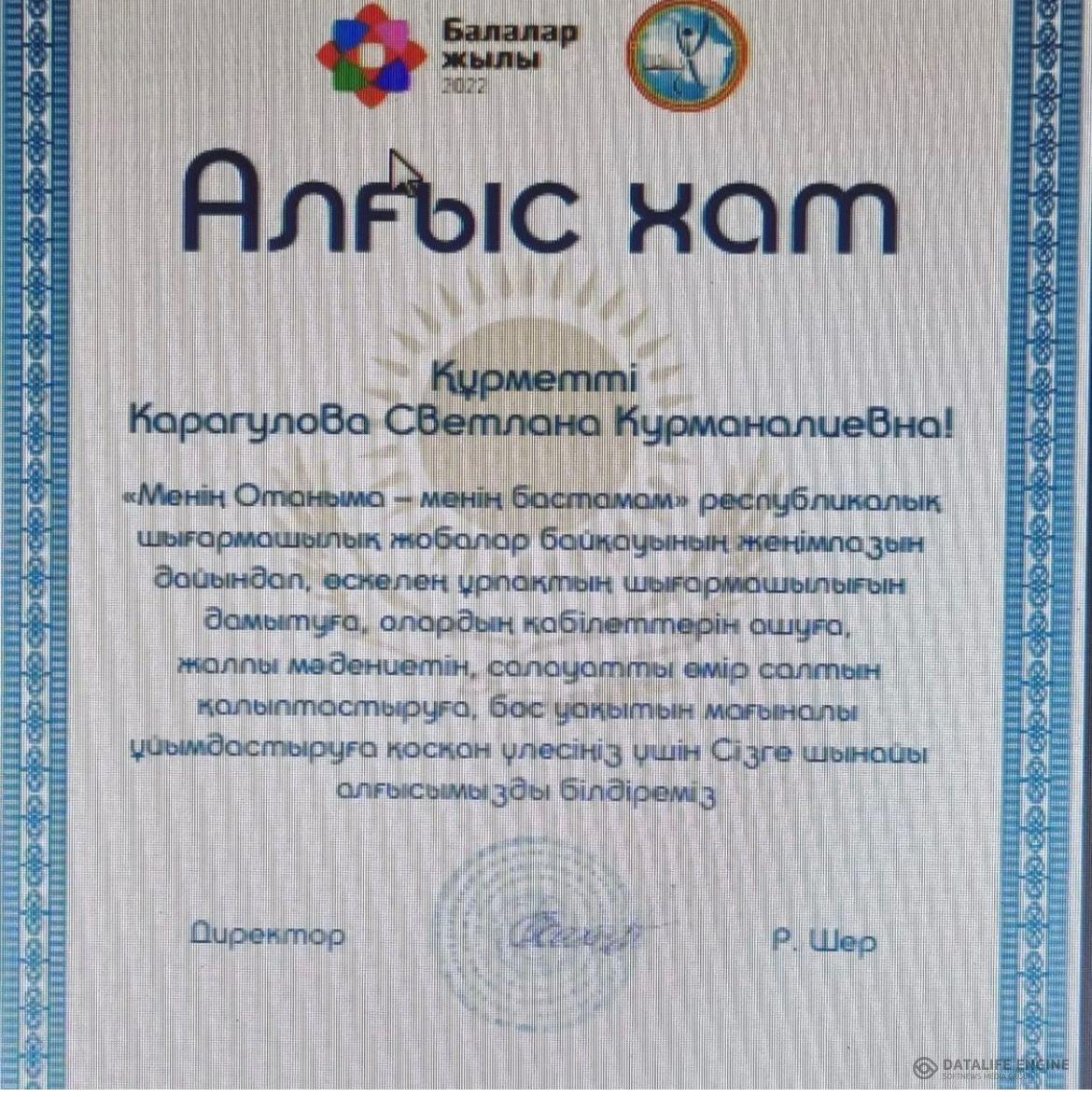 "Менің Отаныма-менің бастамам" республикалық шығармашылық жобалар байқауының жеңімпазын дайындап, олардың қабілеттерін ашуға қосқан үлесіңіз үшін республикалық қосымша білім беру оқу-әдістемелік орталығының директоры Р. Шер Сізге шынайы алғыс білдіреді. Мектебіміздің мәртебесін көтеріп, білімді, мәдениетті, салаутты, тәрбиелі оқушылар дайындап, шыңдай беріңіз. Жеңістеріңіз, жемістеріңіз көп болсын!
