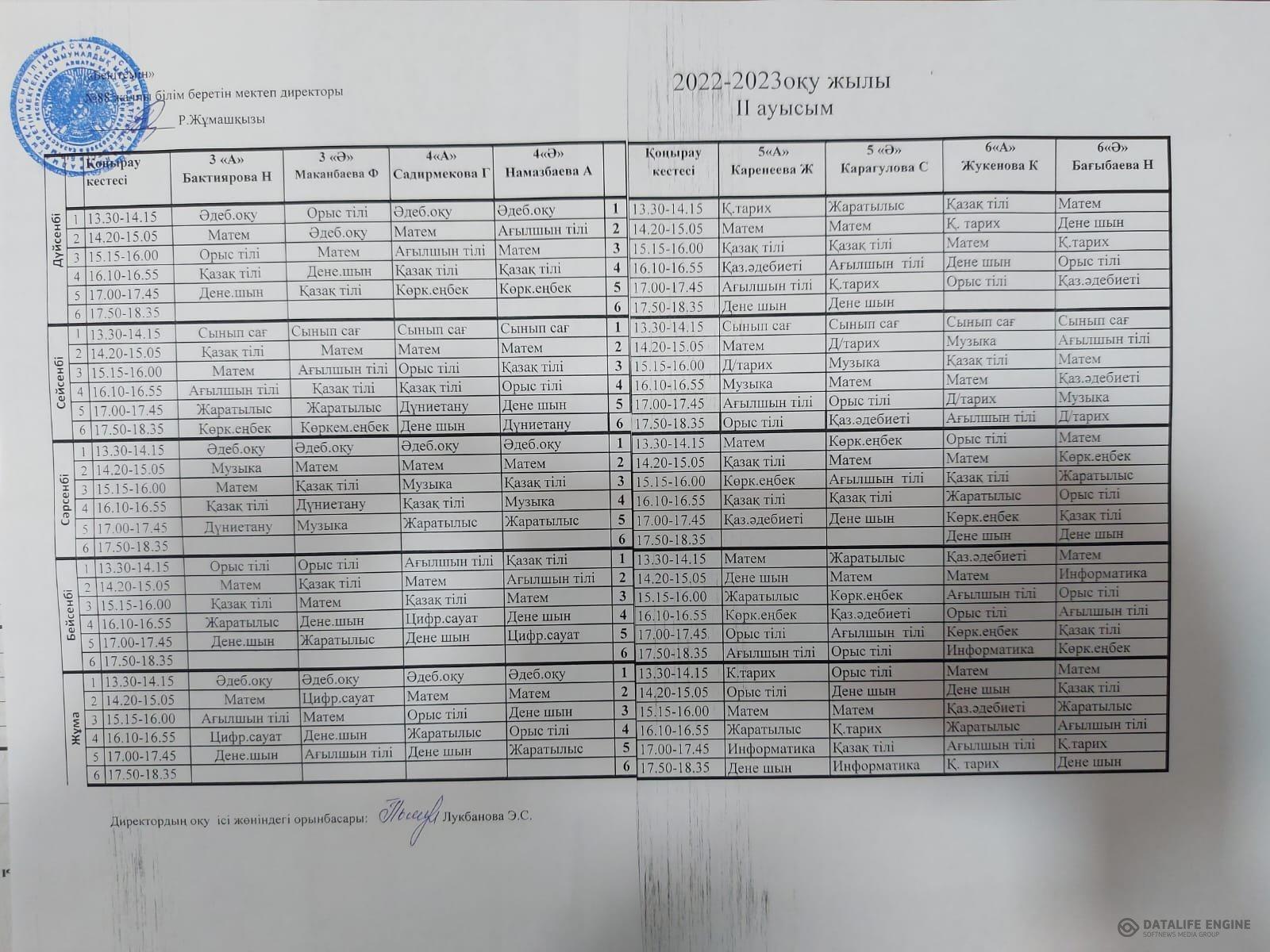 2022-2023 оқу жылы Сабақ кестесі