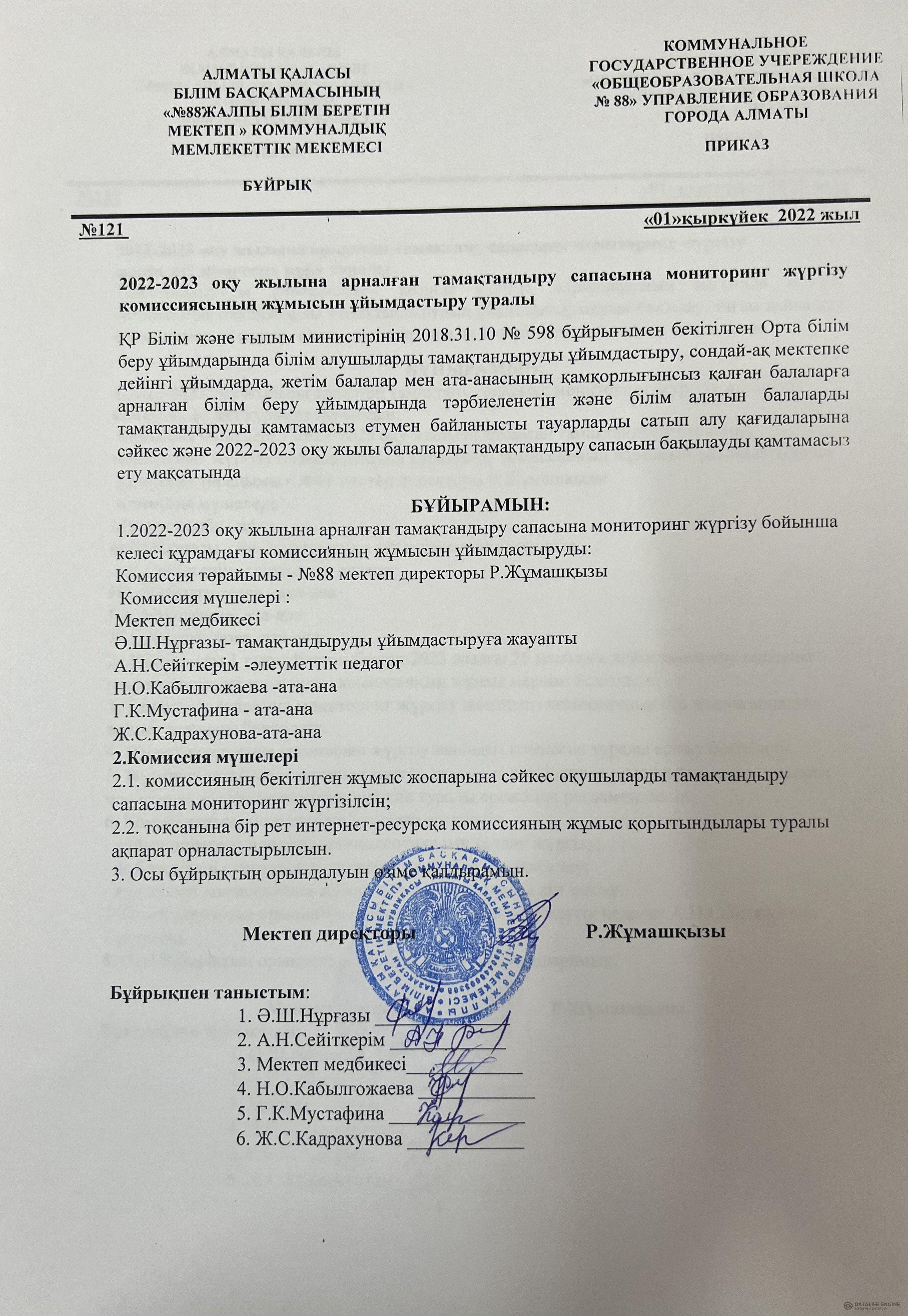 01 сентябрь 2022 0 1 2 3 4 5 2022-2023 оқу жылына арналған тамақтану сапасына мониторинг жүргізу жөніндегі комиссия жұмысын ұйымдастыру туралы бұйрық