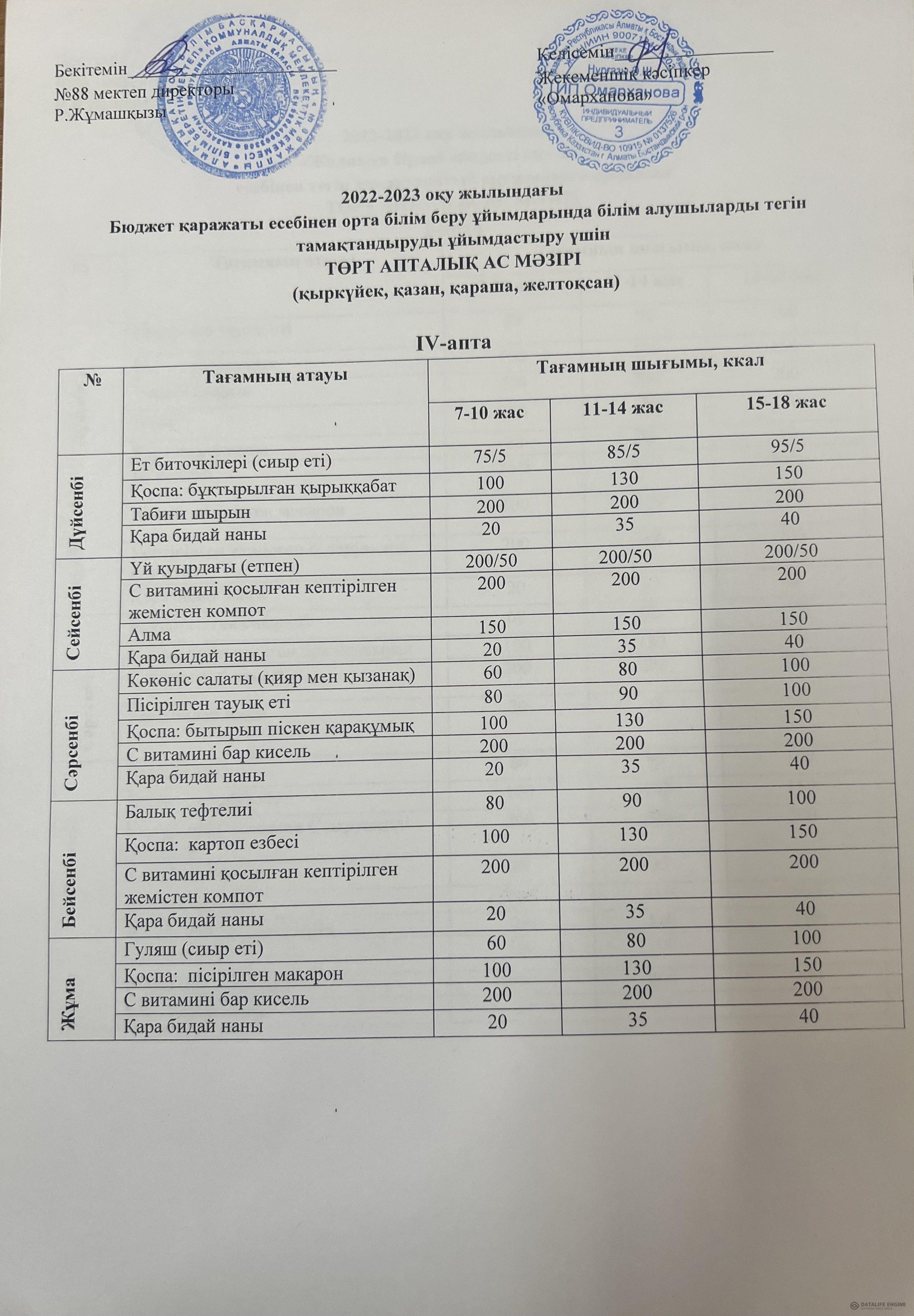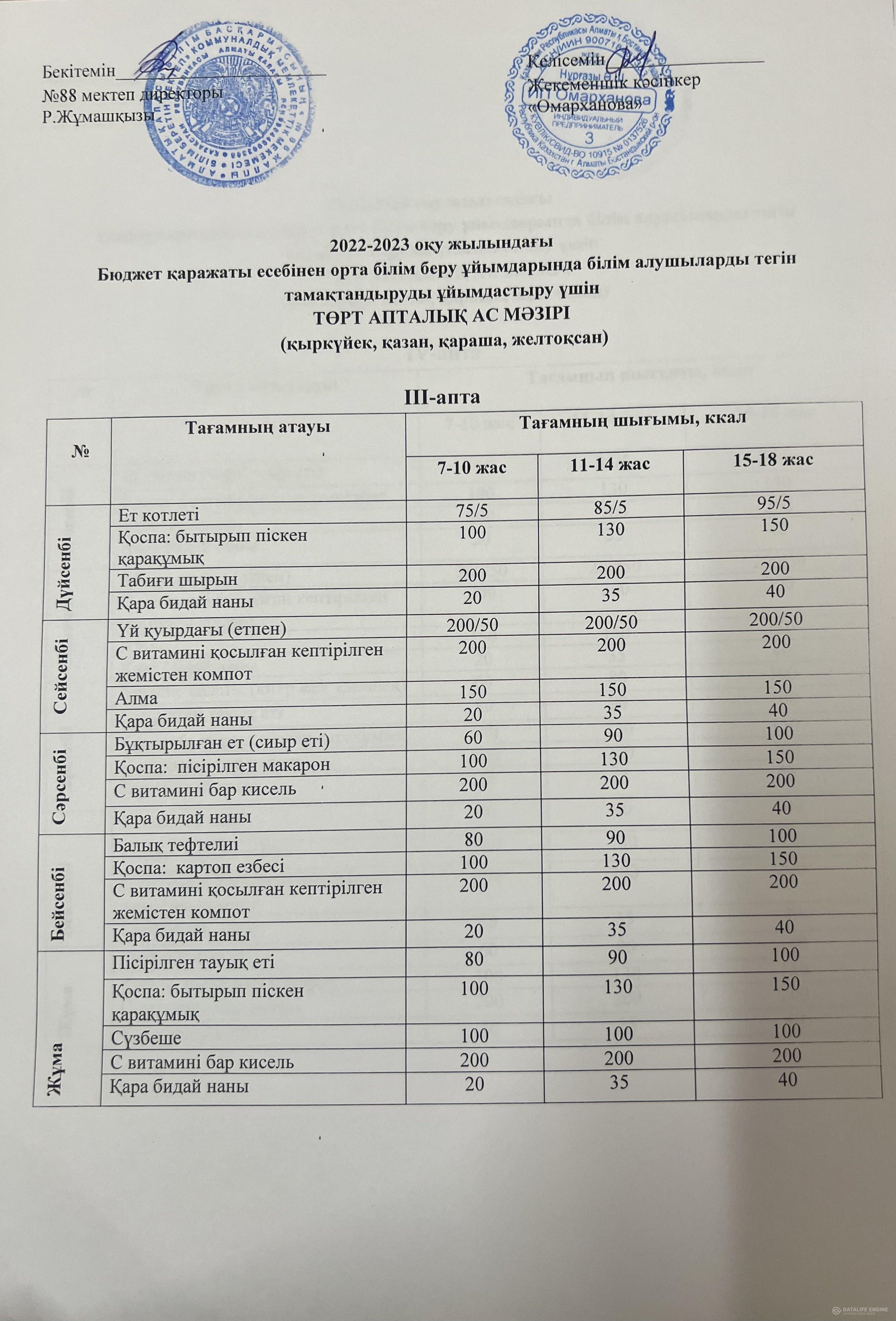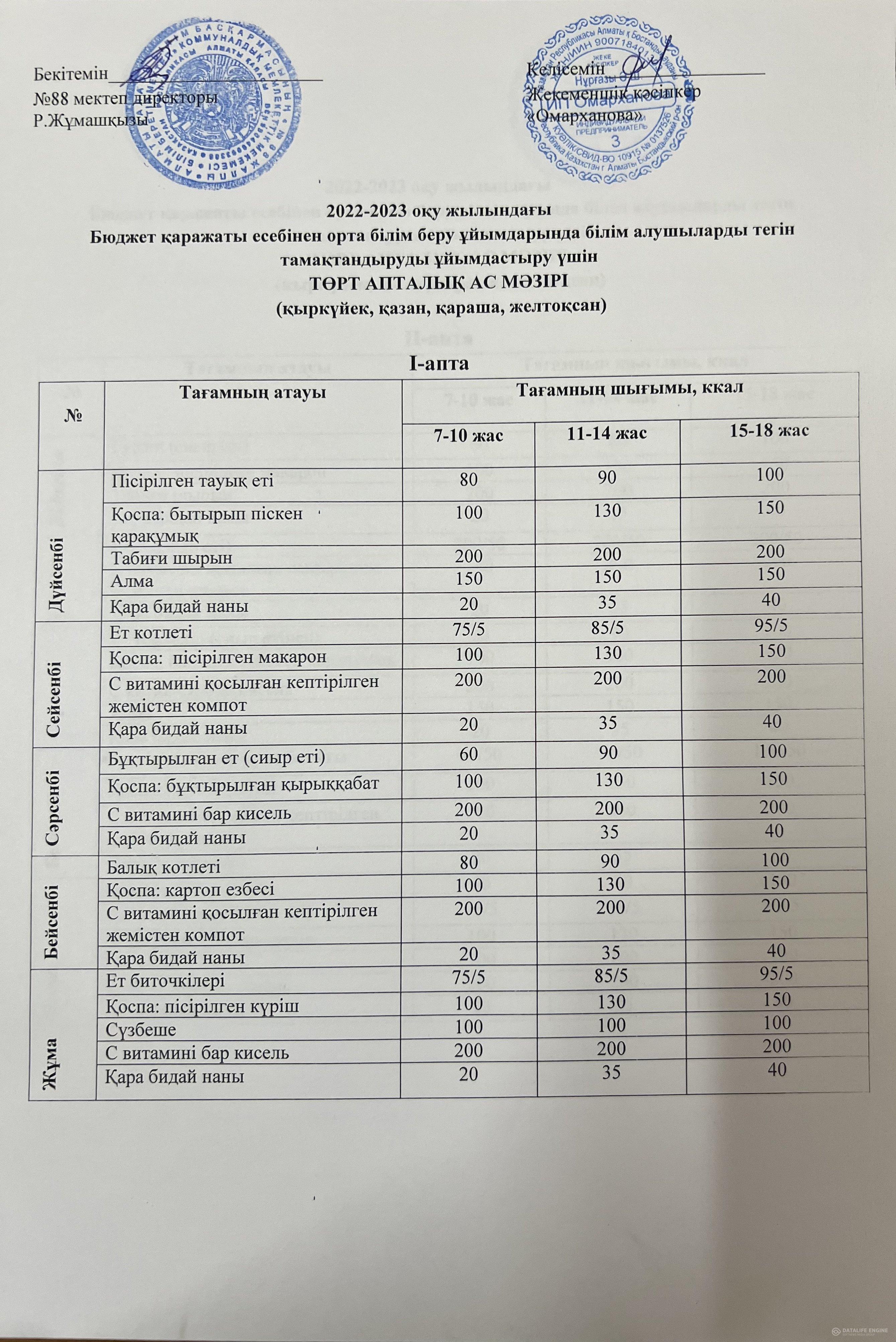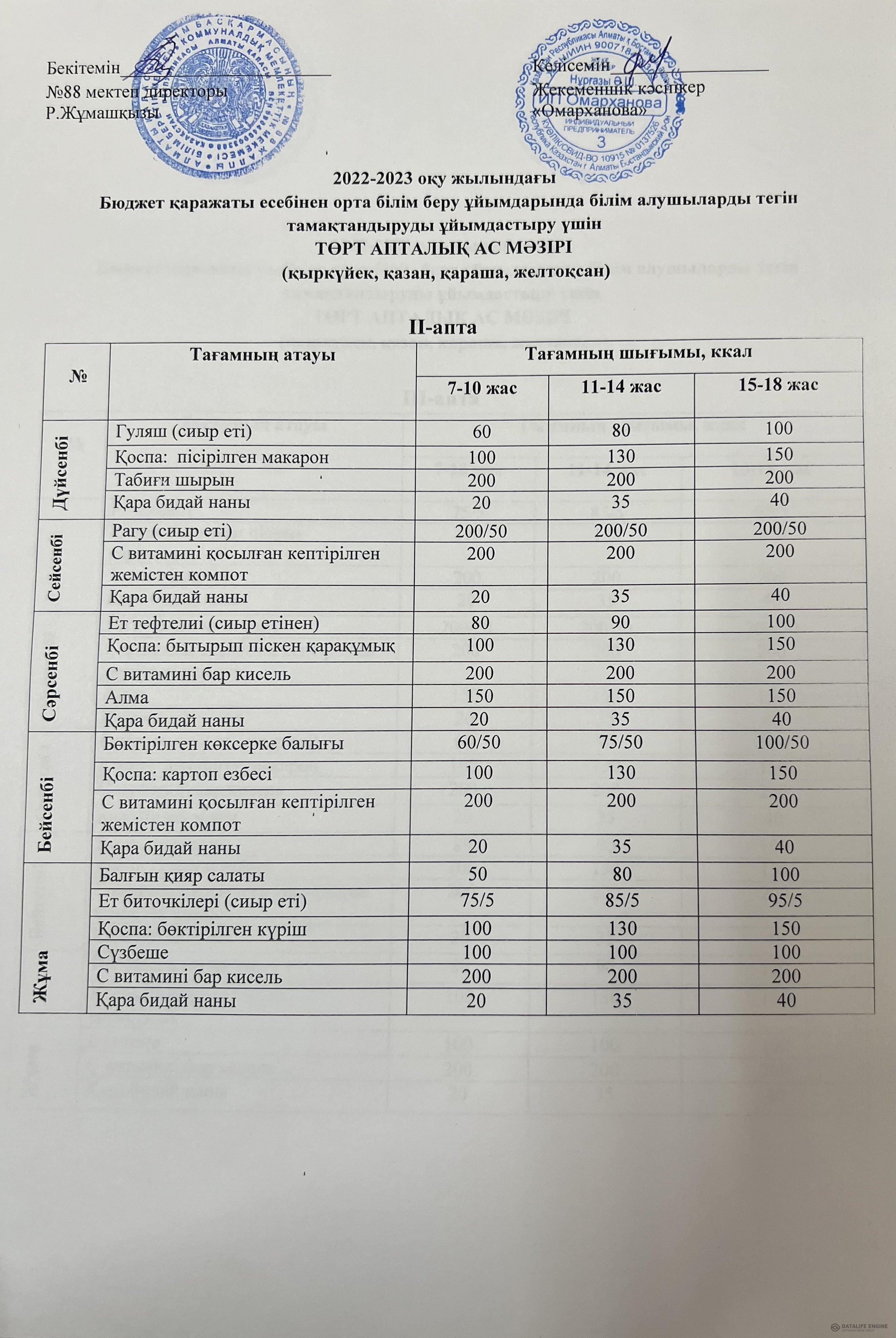 2022-2023 оқу жылына арналған ақылы ас мәзірі