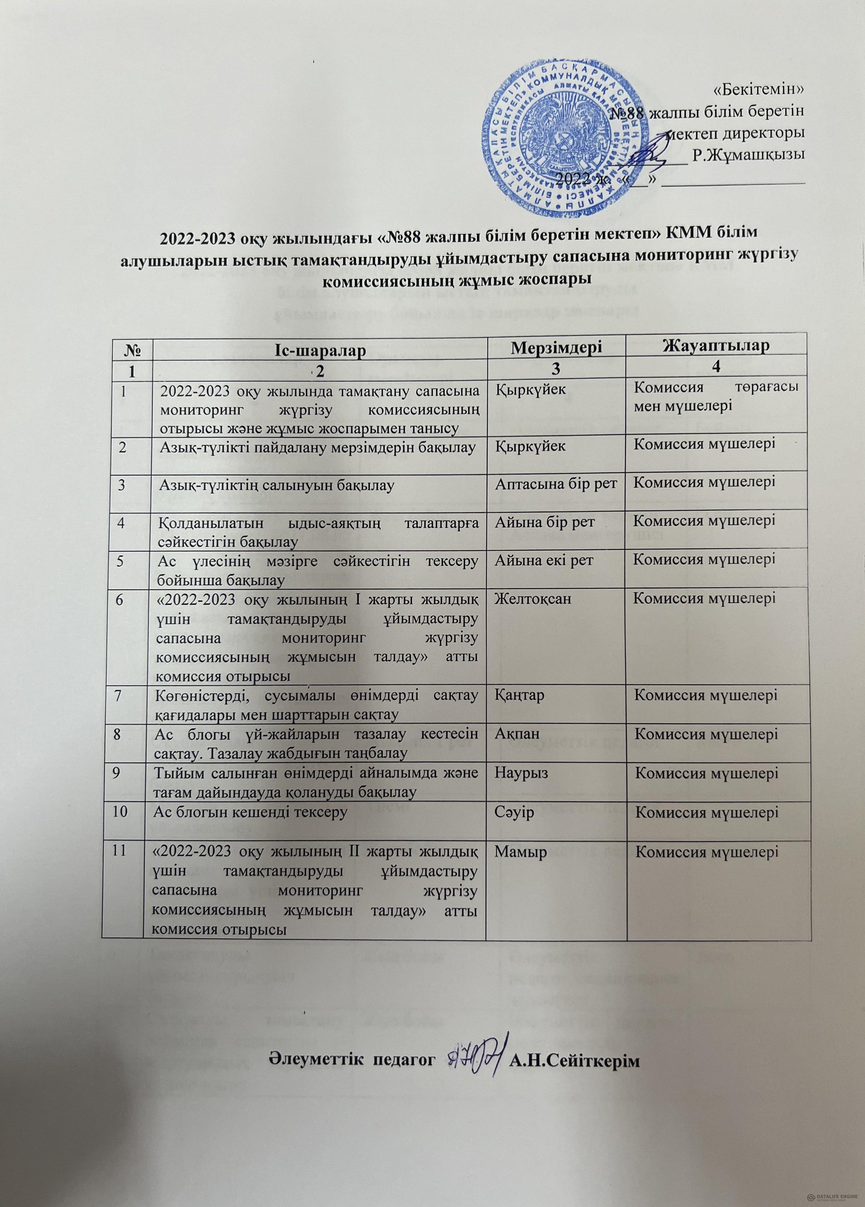Тамақтану сапасына мониторинг жүргізу комиссиясының жұмыс жоспары