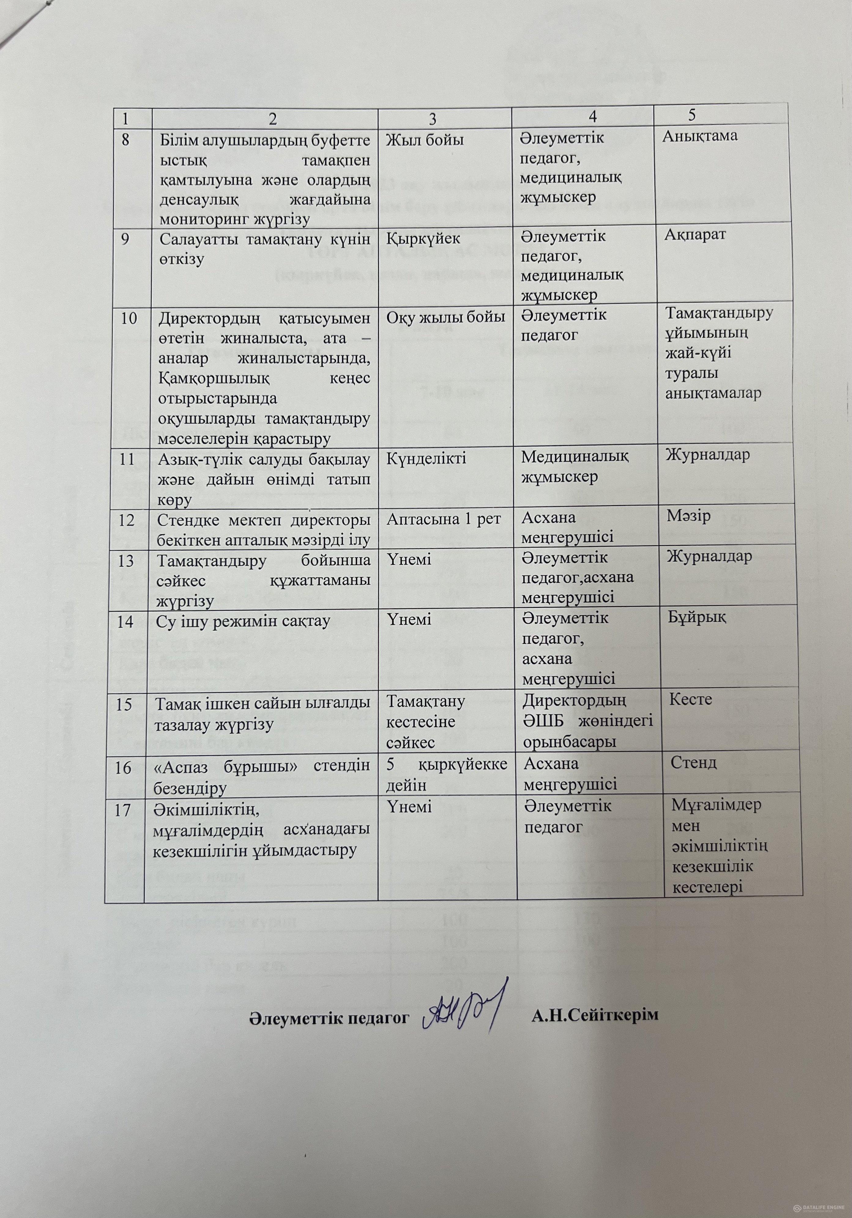 Ыстық тамақтандыруды ұйымдастыру сапасына мониториг жүргізу комиссиясының жұмыс жоспары