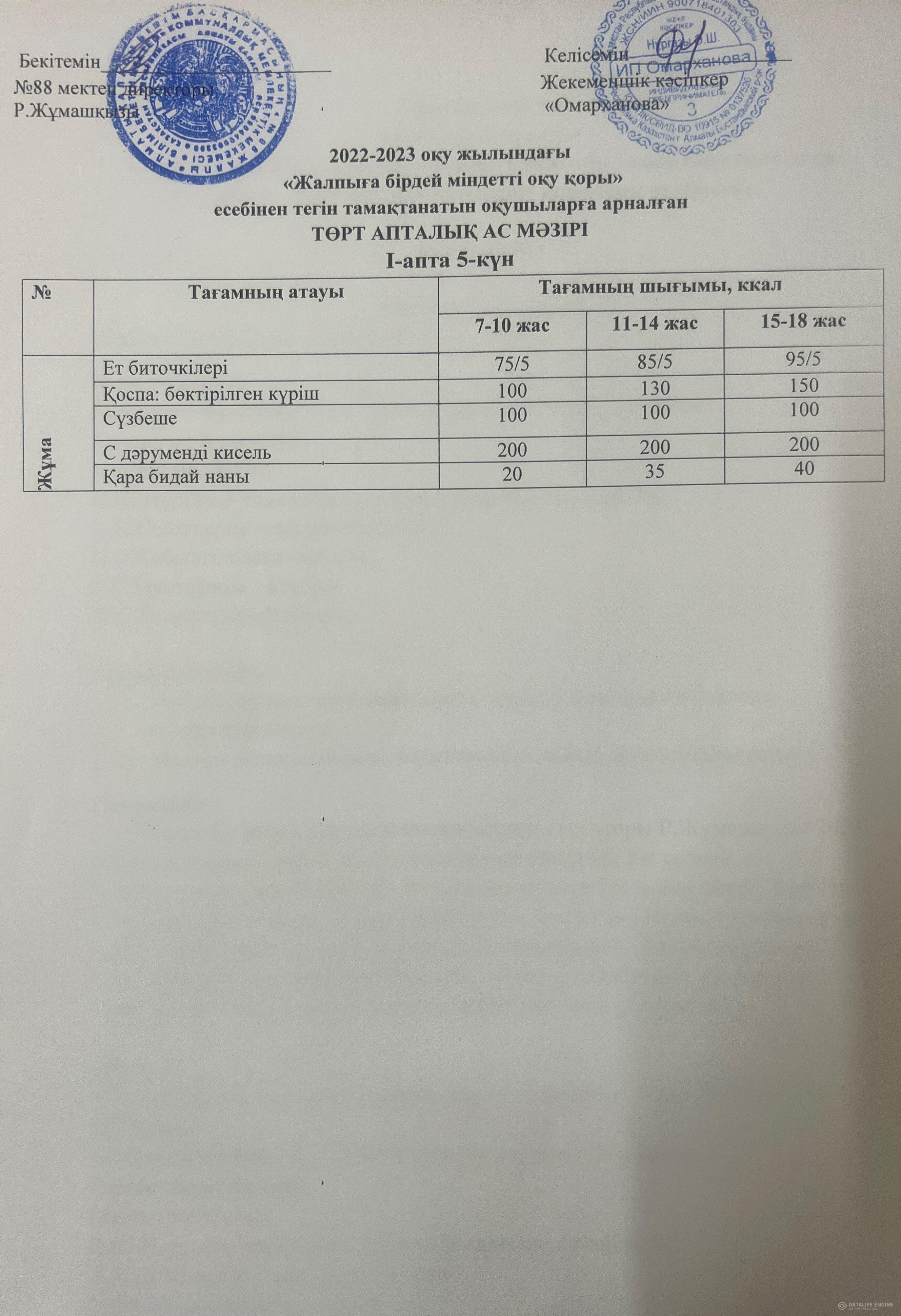 2022-2023 оқу жылына арналған ақылы ас мәзірі