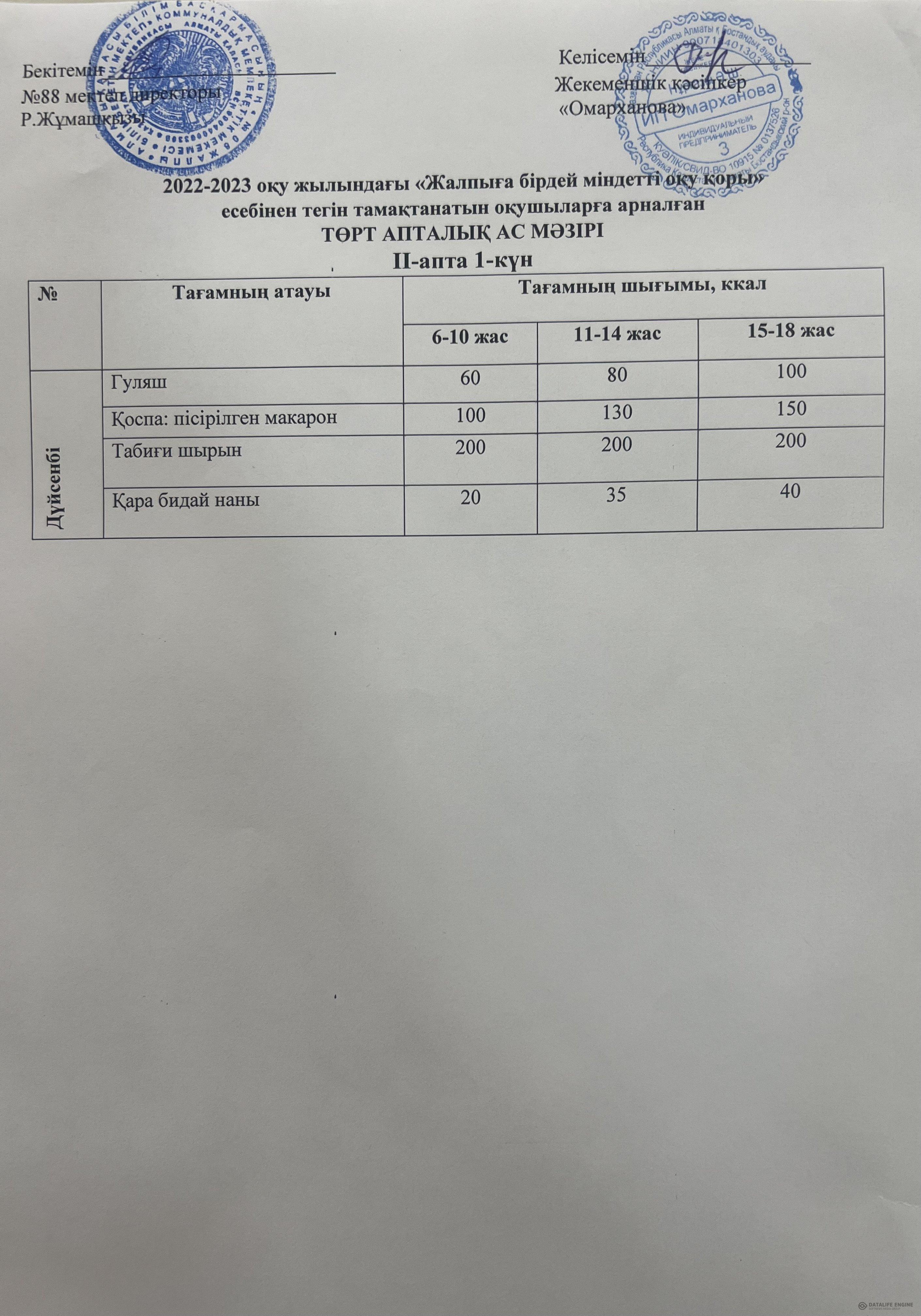 2022-2023 оқу жылына арналған ақылы ас мәзірі