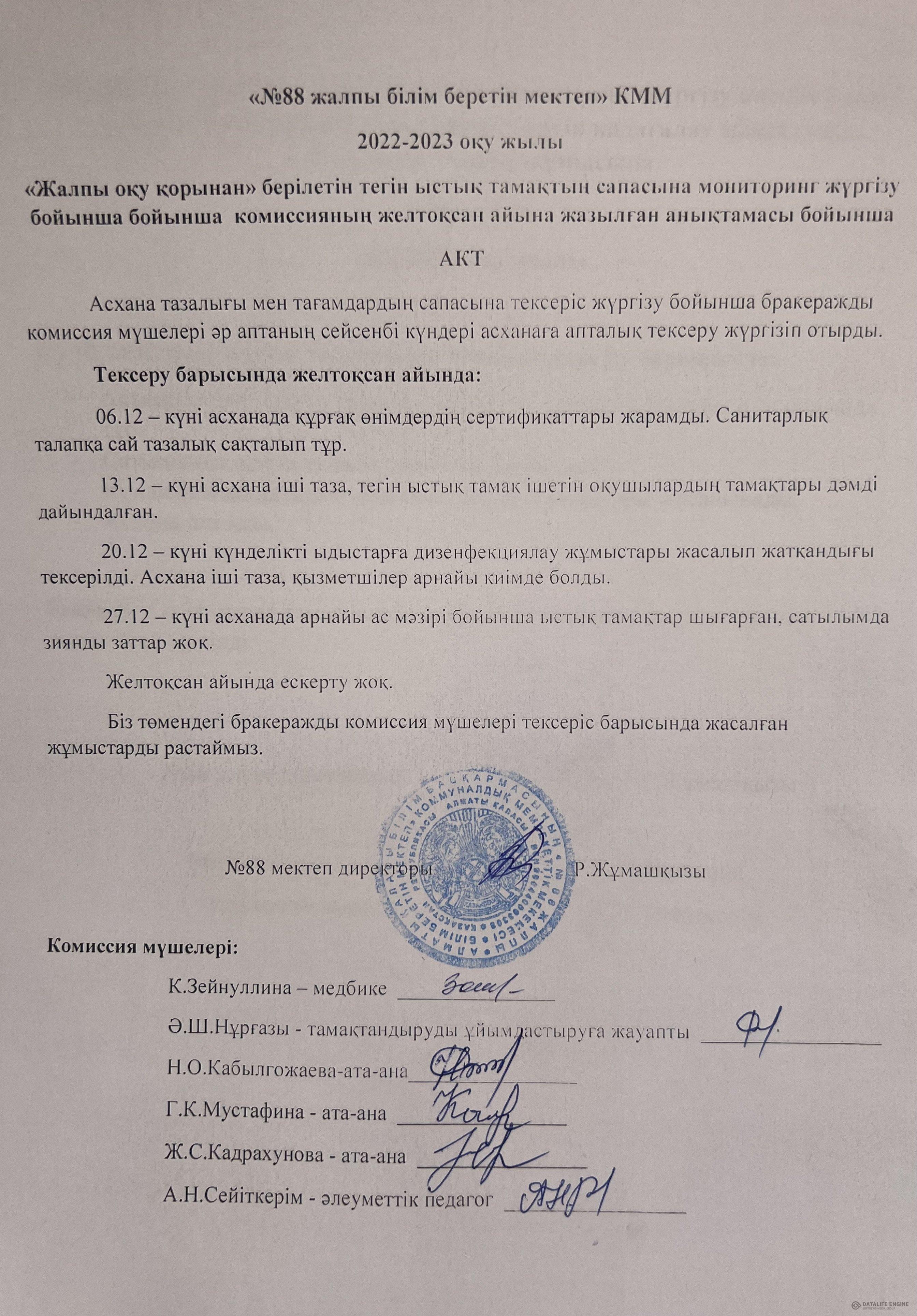 31 декабрь 2022 0 1 2 3 4 5 Желтоқсан айына тамақтану сапасына мониторинг жүргізу комиссиясының асхананы тексеру бойынша АКТ
