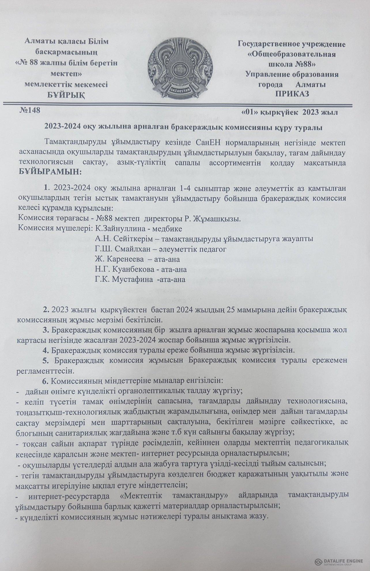 2023-2024 оқу жылына арналған тамақтандыру сапасына мониторинг жүргізу комиссиясының жұмысын ұйымдастыру туралы бұйрық