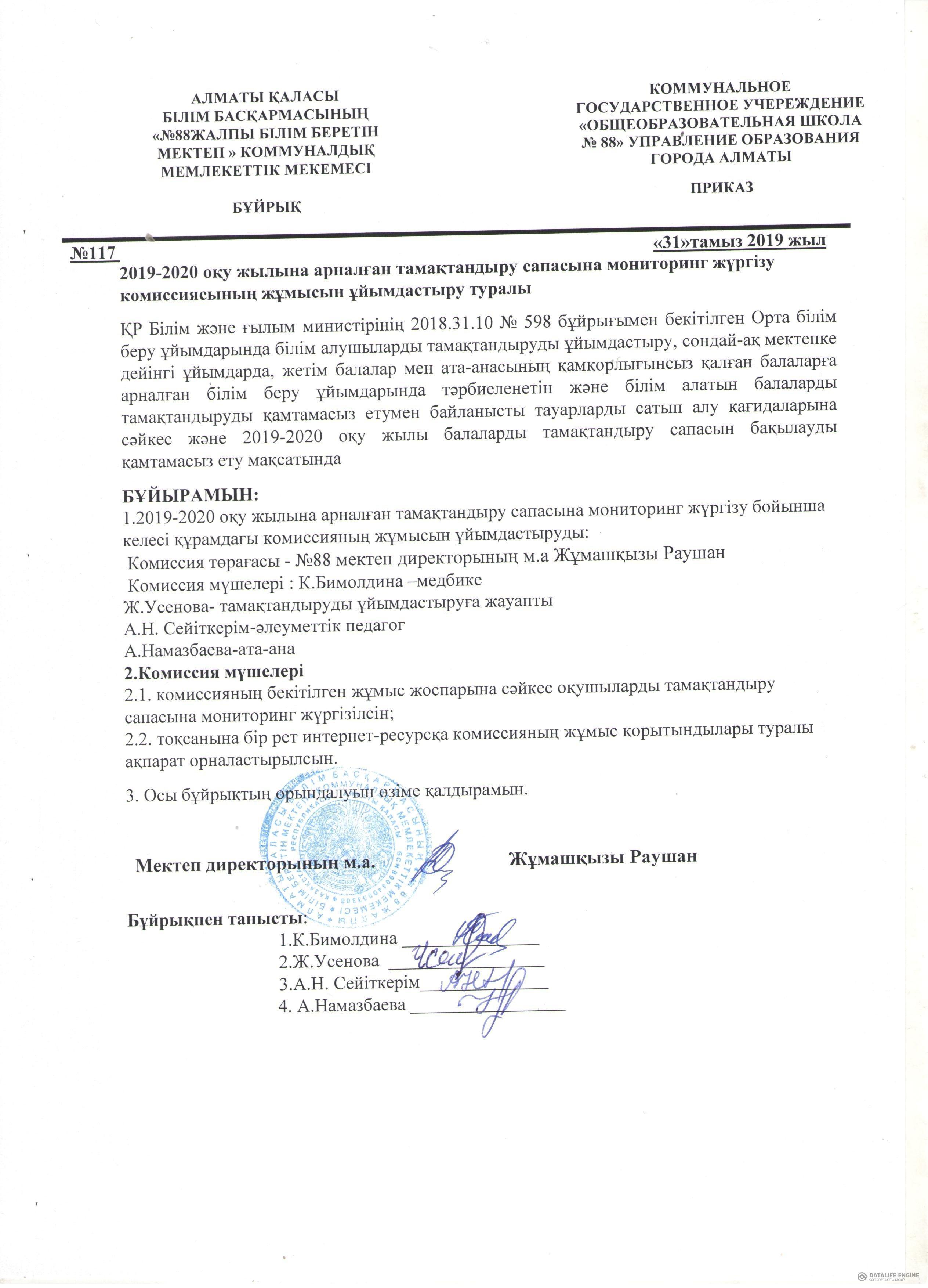 02 сентябрь 2019 0 1 2 3 4 5 Тамақтандыру сапасына мониторинг жүргізу комиссиясының жұмысын ұйымдастыру туралы бұйрық