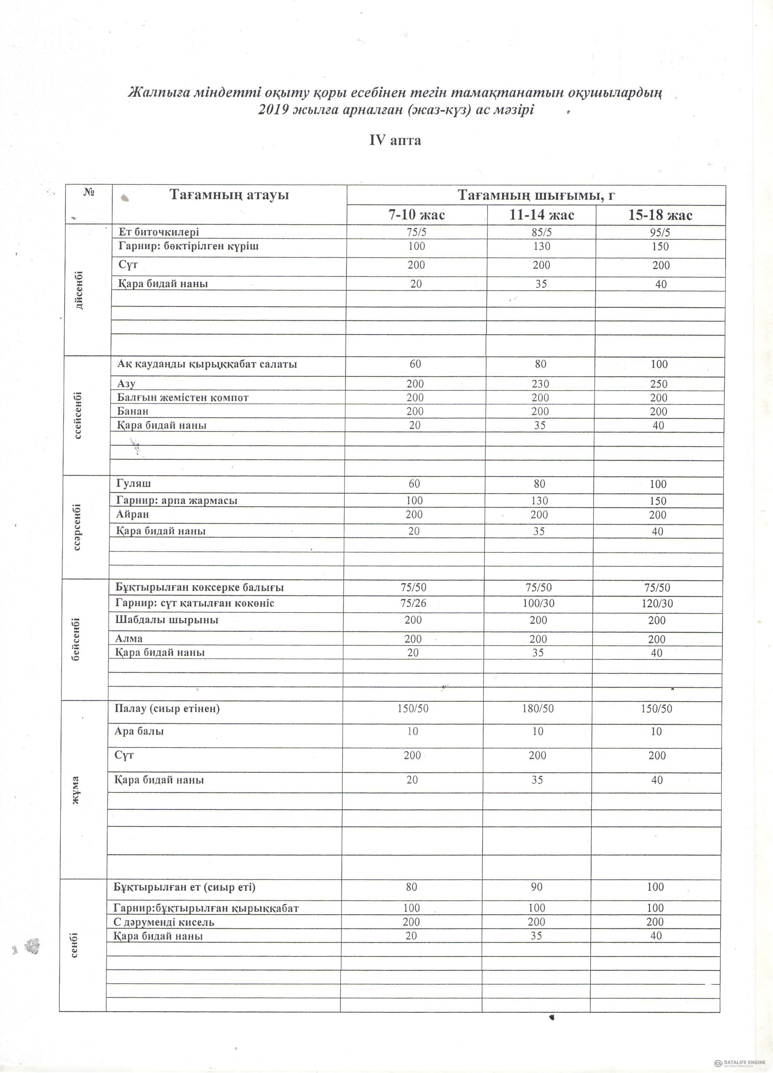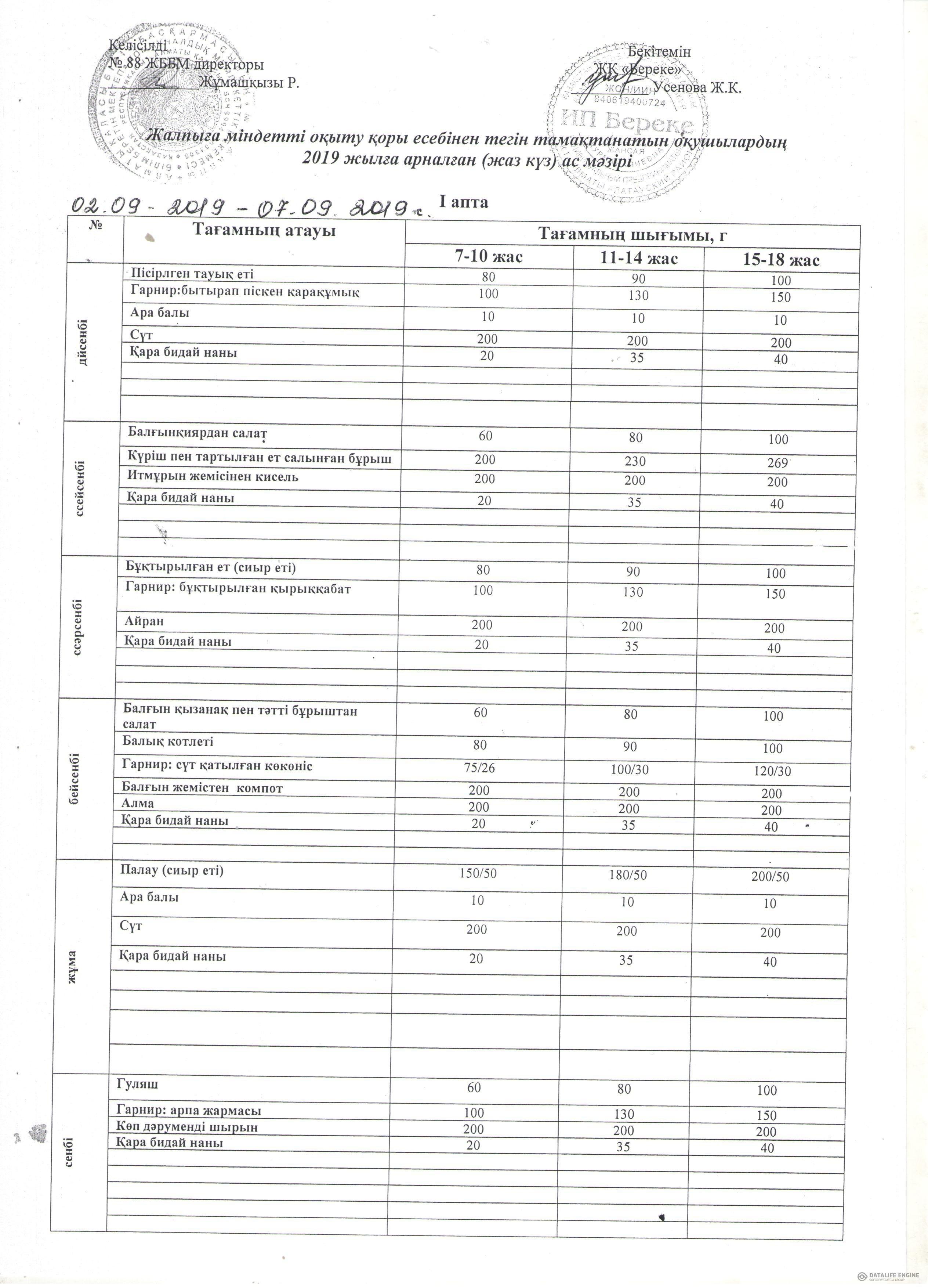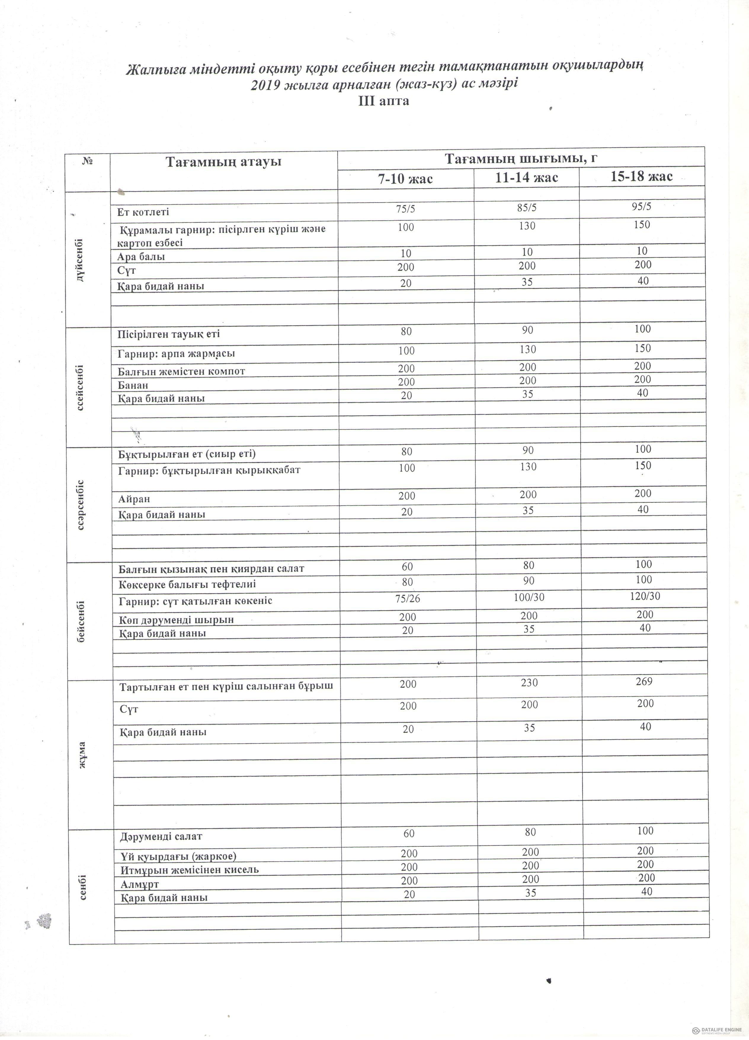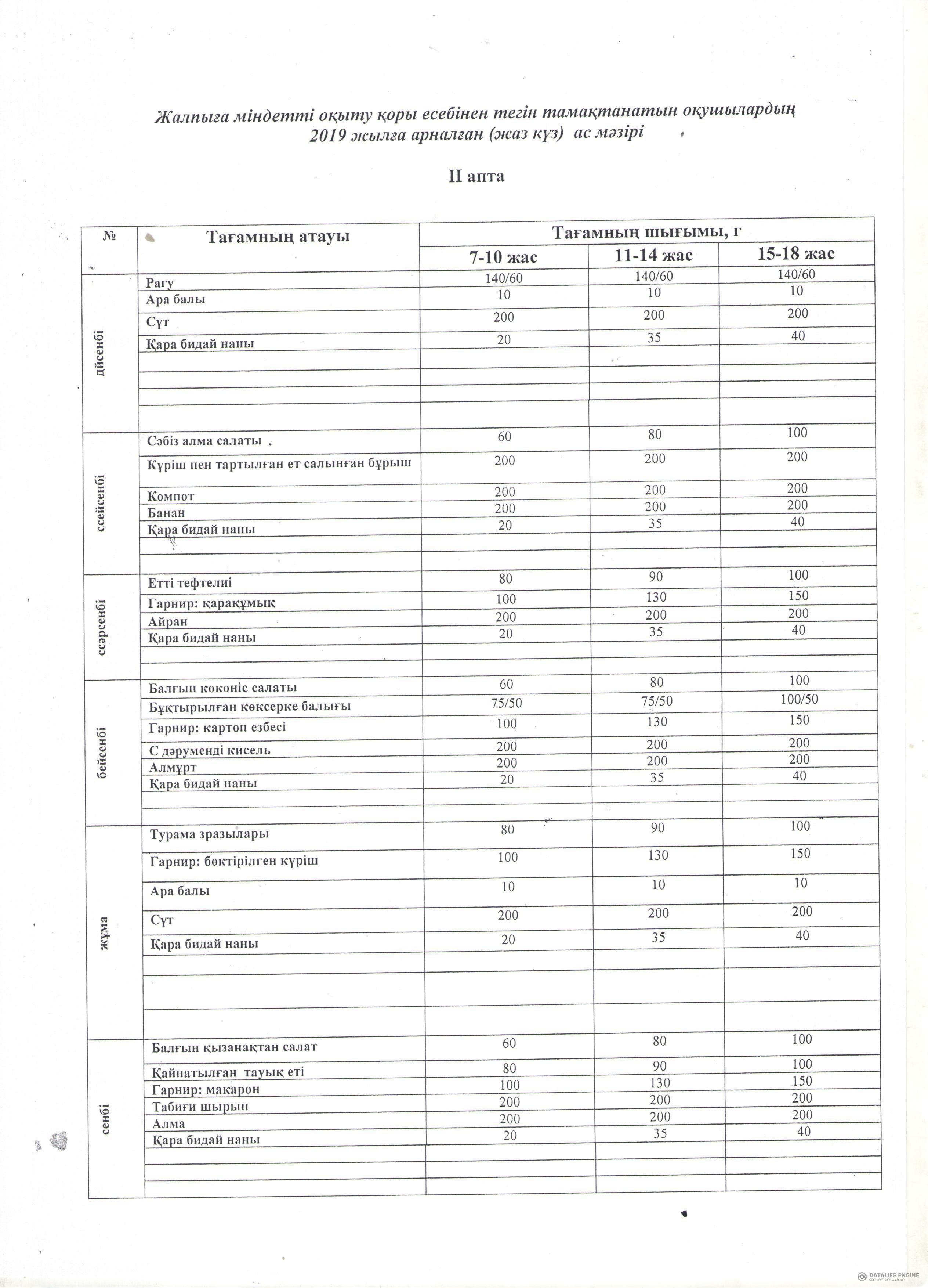 02 сентябрь 2019 0 1 2 3 4 5 Жалпыға міндетті есебінен тегін тамақтанатын оқушылардың 2019-2020 оқу жылына арналған ас мәзірі /жаз,күз/
