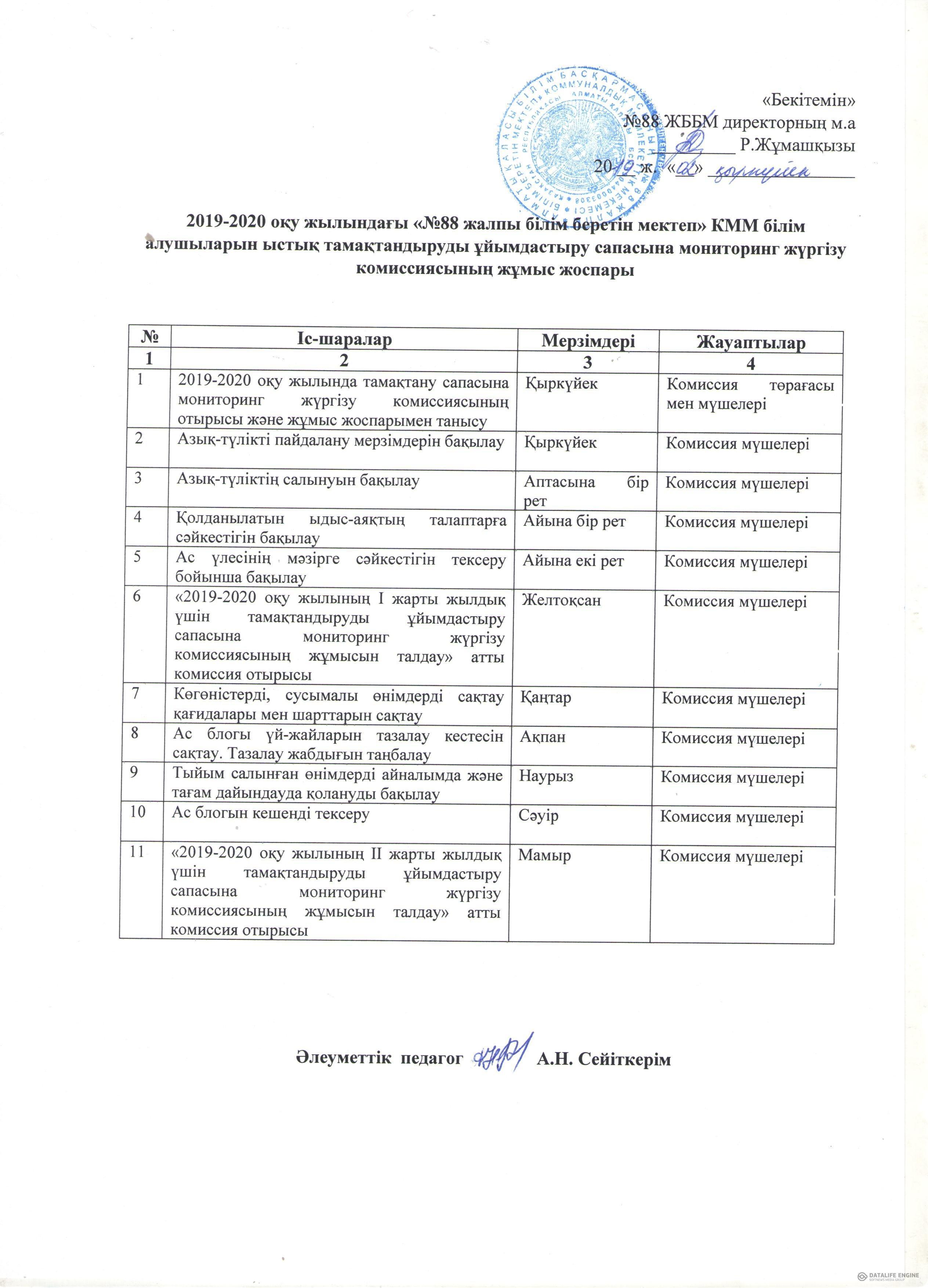 02 сентябрь 2019 0 1 2 3 4 5 Ыстық тамақтандыруды ұйымдастыру сапасына мониториг жүргізу комиссиясының жұмыс жоспары