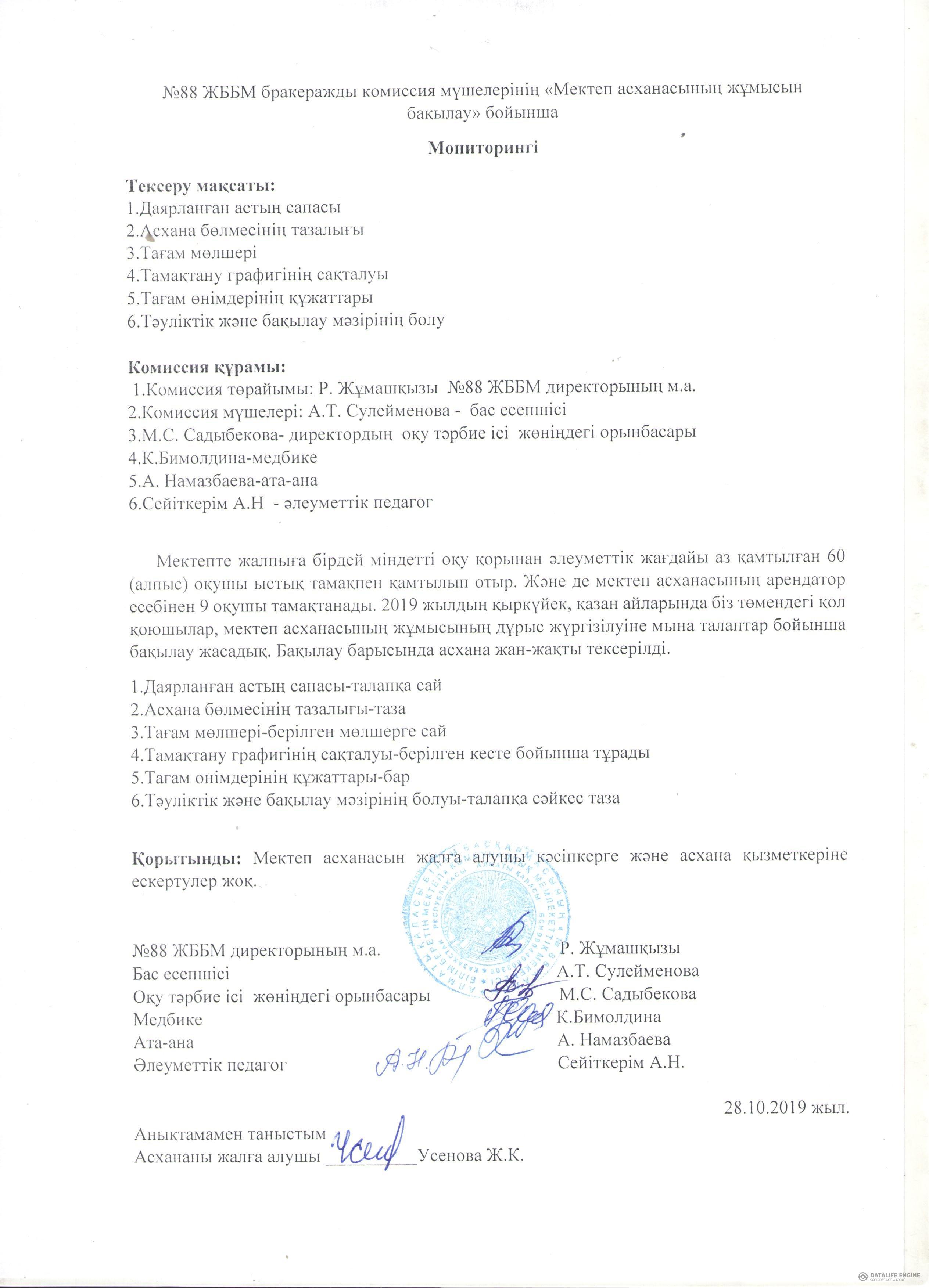 28 октябрь 2019 0 1 2 3 4 5 №88 жалпы білім беретін мектептің асхана жұмысын бақылау бойынша мониторинг