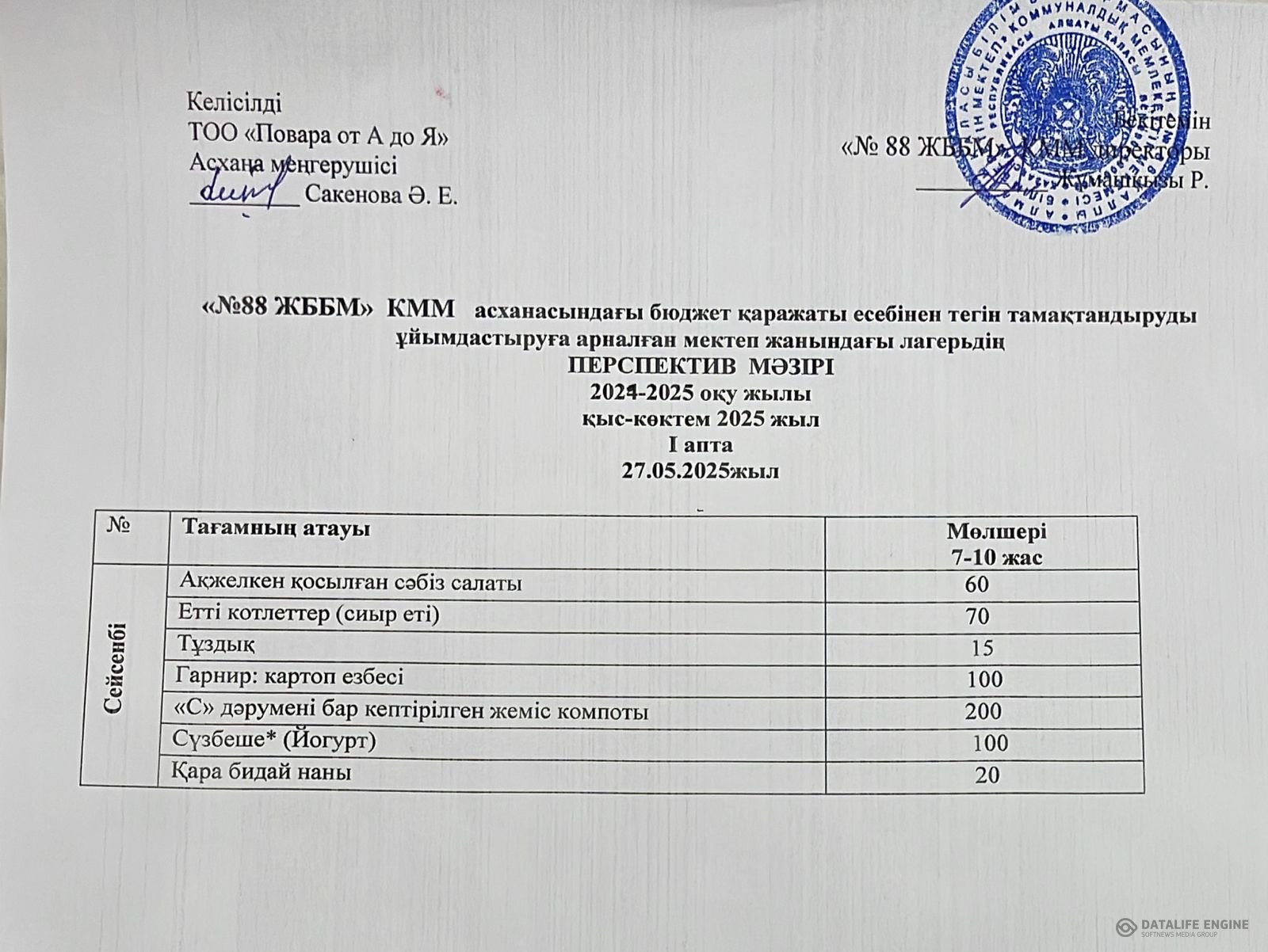 27.05.2025 ж. жазғы мектеп жанындағы лагерьдің ас мәзірі (фотосуреті)