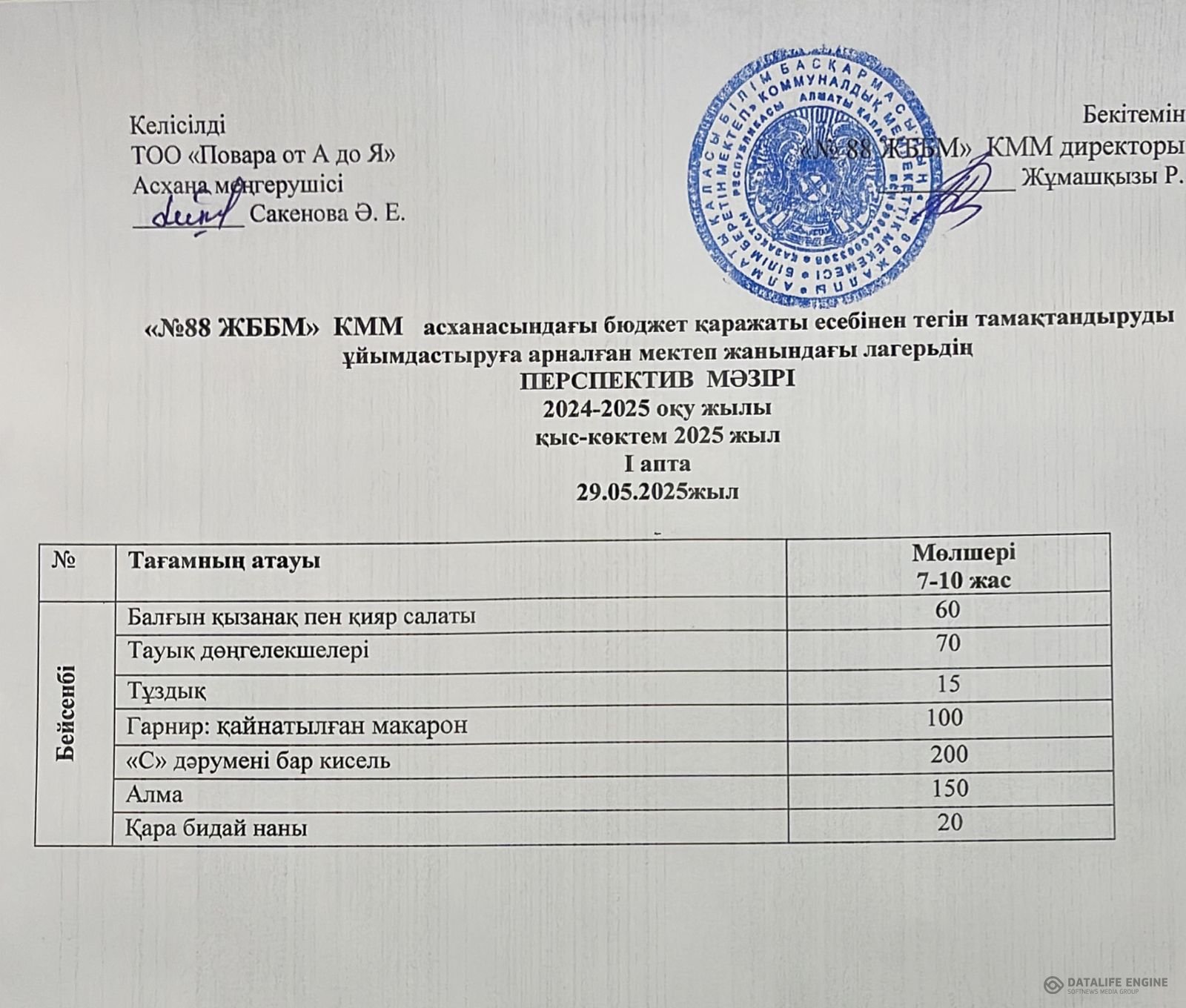 29.05.2025 ж. жазғы мектеп жанындағы лагерьдің ас мәзірі (фотосуреті)
