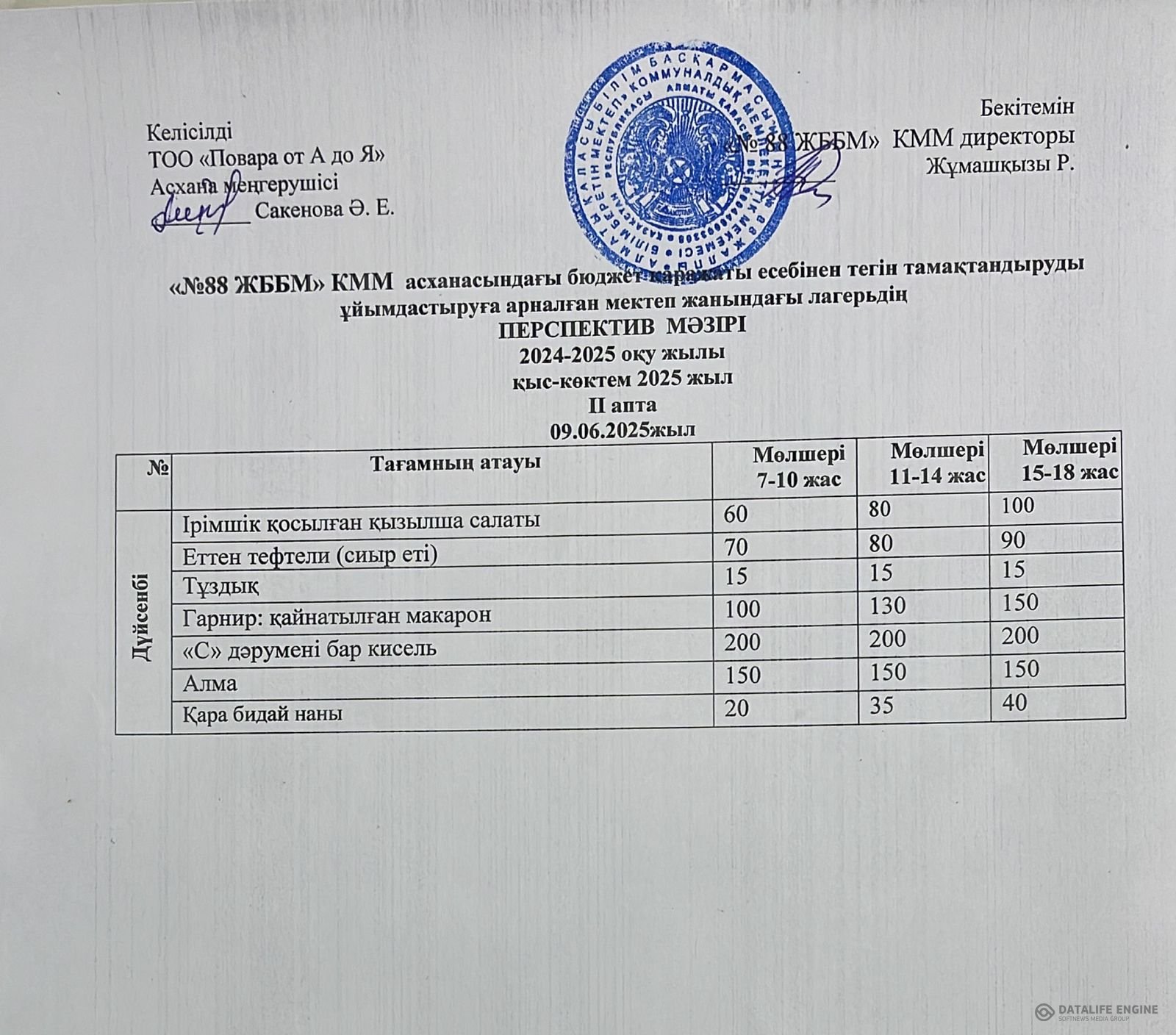 » 09.06.2025 ж. жазғы мектеп жанындағы лагерьдің ас мәзірі (фотосуреті)